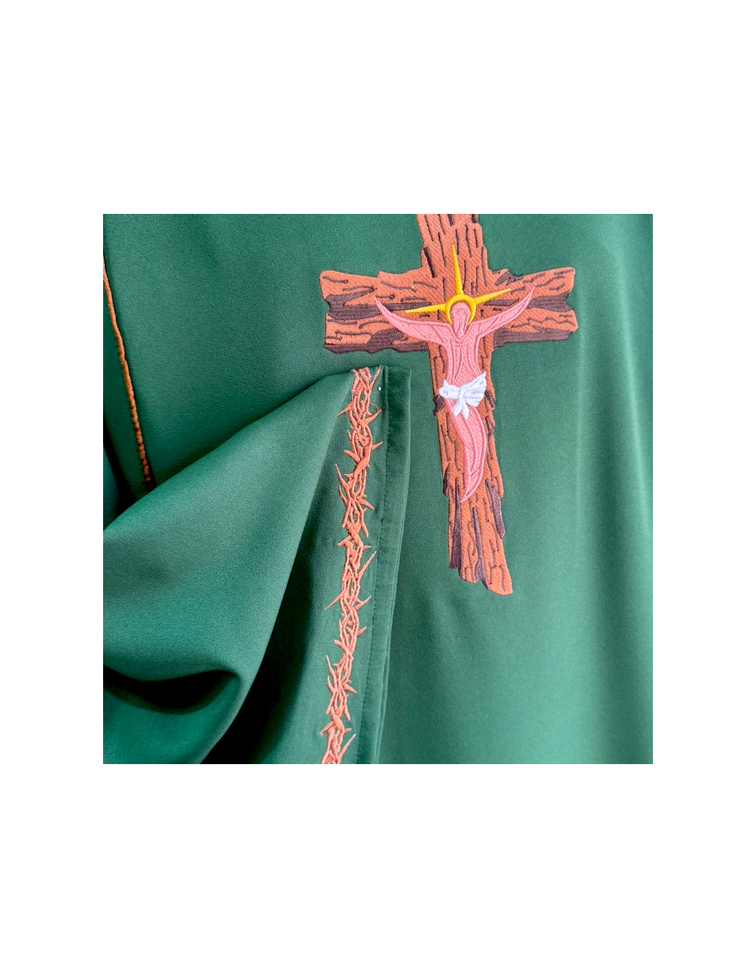 Chasuble “The Lord’s Thorns” available in the four liturgical colors, with thorn embroidery around the edge, Christ on the Cross on the front and JHS on the back. Fully lined inside.