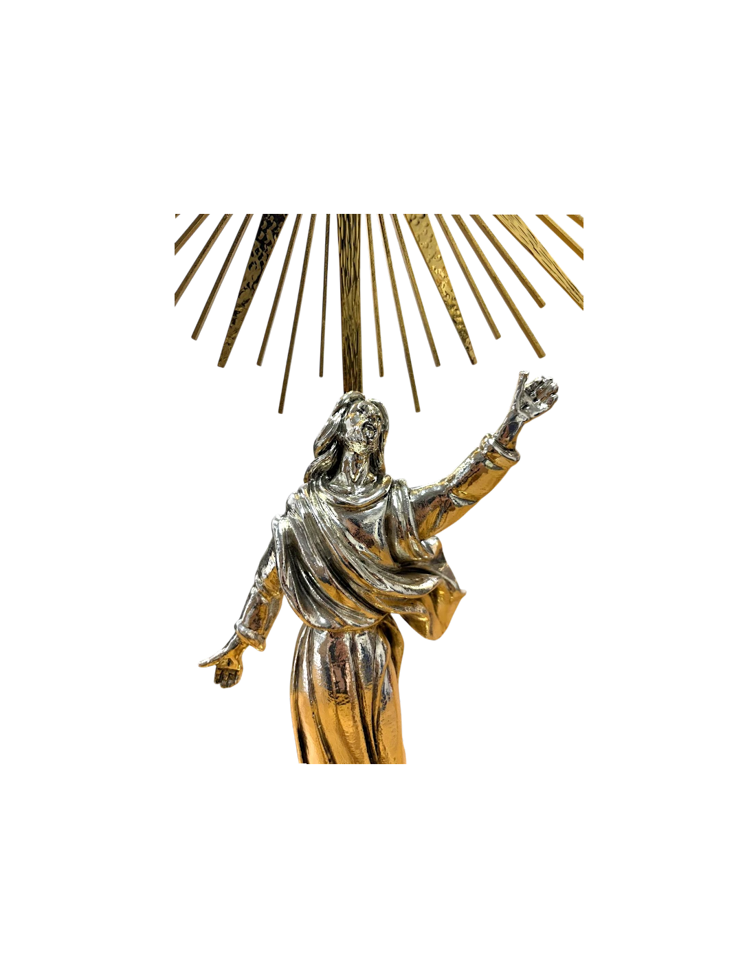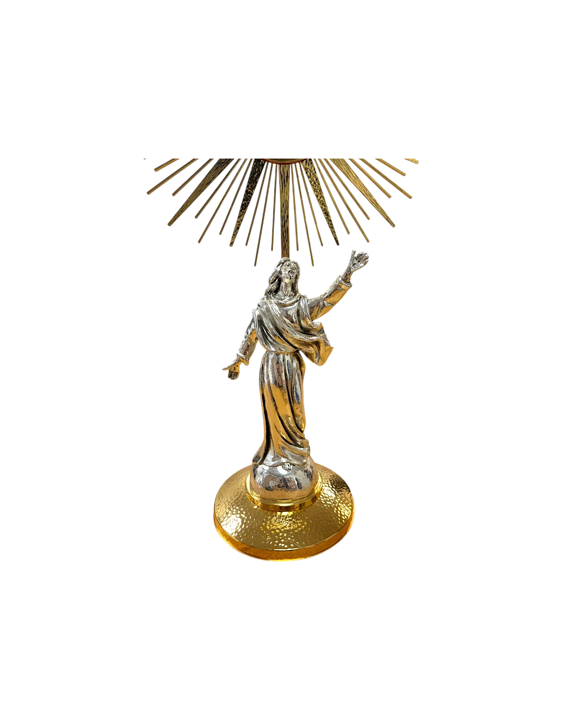 66 cm monstrance with golden sunburst, 9 cm luna and Christ figure. Perfect for Eucharistic adoration.