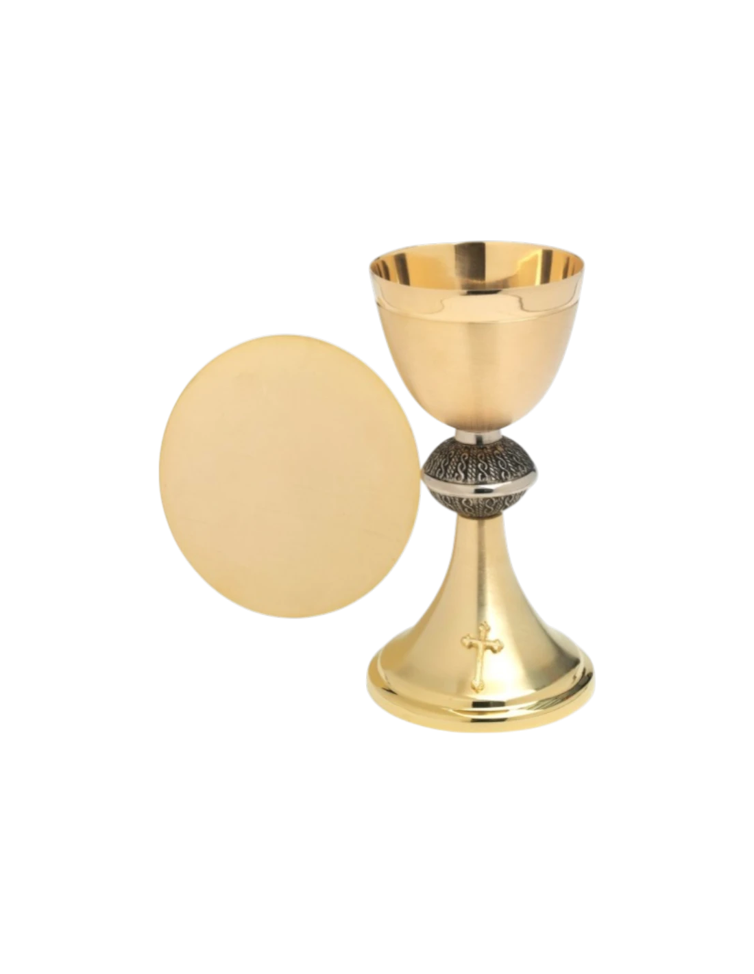 - Paten: With a diameter of 12.5 cm, finished in polished brass to match the rest of the set.