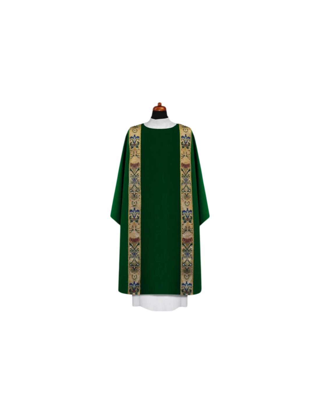 It is characterized by its elegant decoration with ornamental fabric and by the beauty of its braid, crafted with a wide variety of details, colors, and floral motifs, which make this dalmatic a garment of special presence for the altar. An ideal choice for those seeking a carefully crafted, solemn liturgical vestment with embroidery where every detail makes a difference.