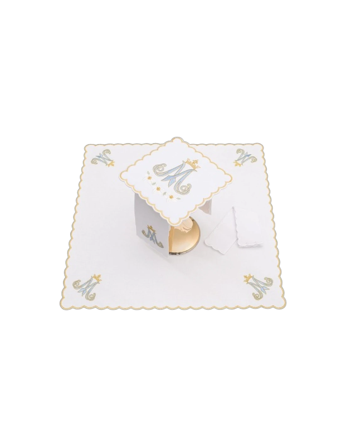 This delicate embroidered altar set is decorated with the Marian monogram accompanied by lilies, a flower that represents the purity of the Virgin Mary. An elegant set with deep symbolic meaning, ideal for Marian celebrations or those dedicated to the Immaculate Conception.