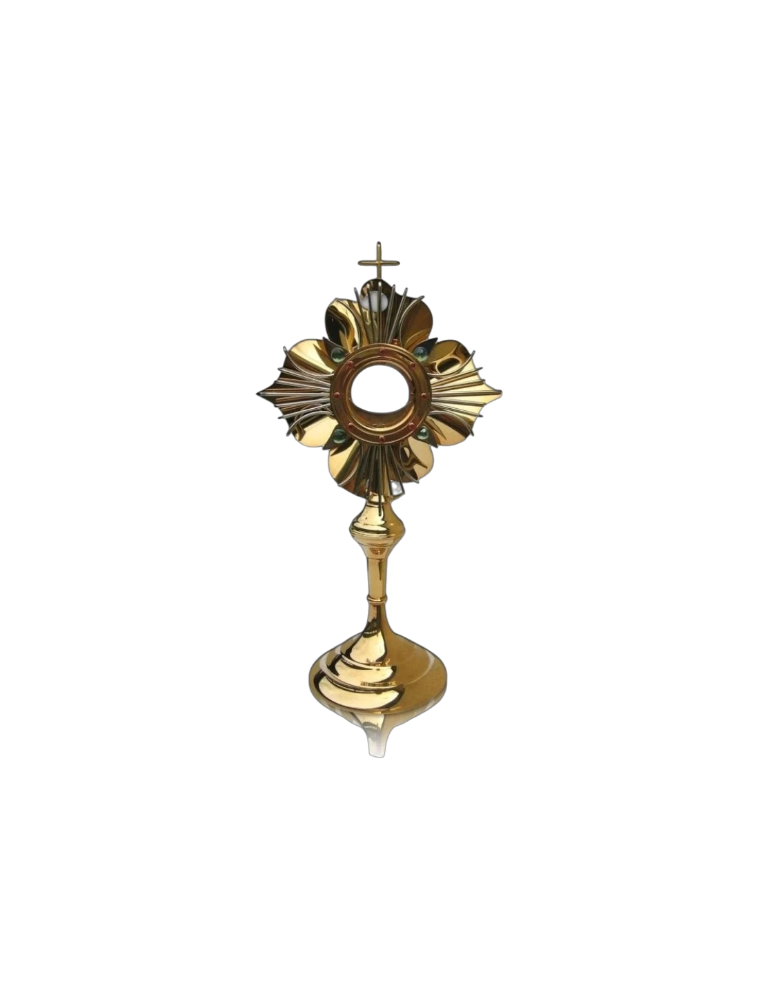 Crafted in gold-plated metal, this monstrance stands out for its visual strength while maintaining the delicacy of its forms. It is an ideal choice for adoration chapels, main altars, or especially solemn liturgical celebrations.