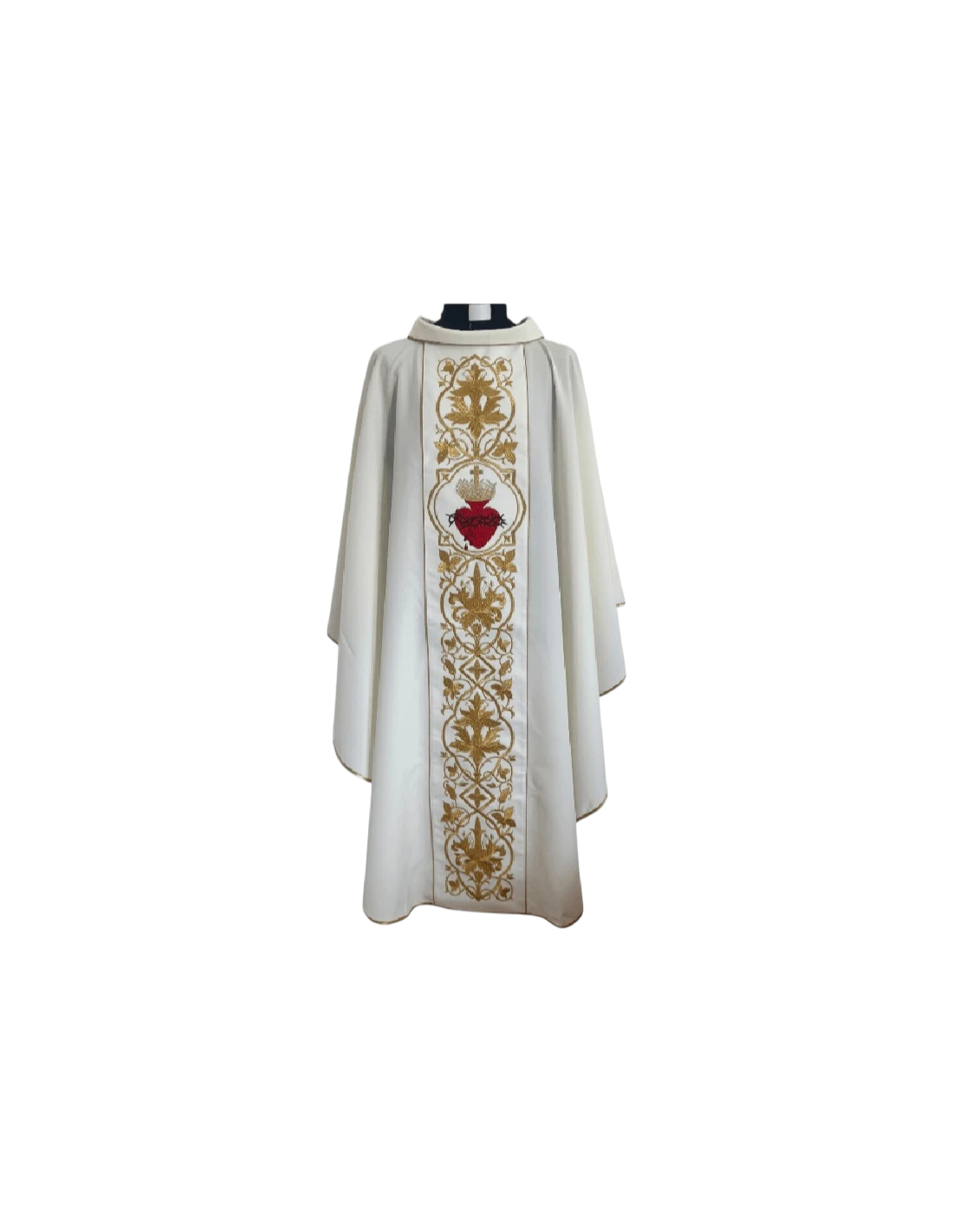 Sacred Heart of Jesus Chasuble in white with gold embroidery Elegant polyester chasuble featuring an ornamental central orphrey and the image of the Sacred Heart of Jesus, symbol of love and devotion. Ideal for solemn celebrations and feasts dedicated to the Sacred Heart.