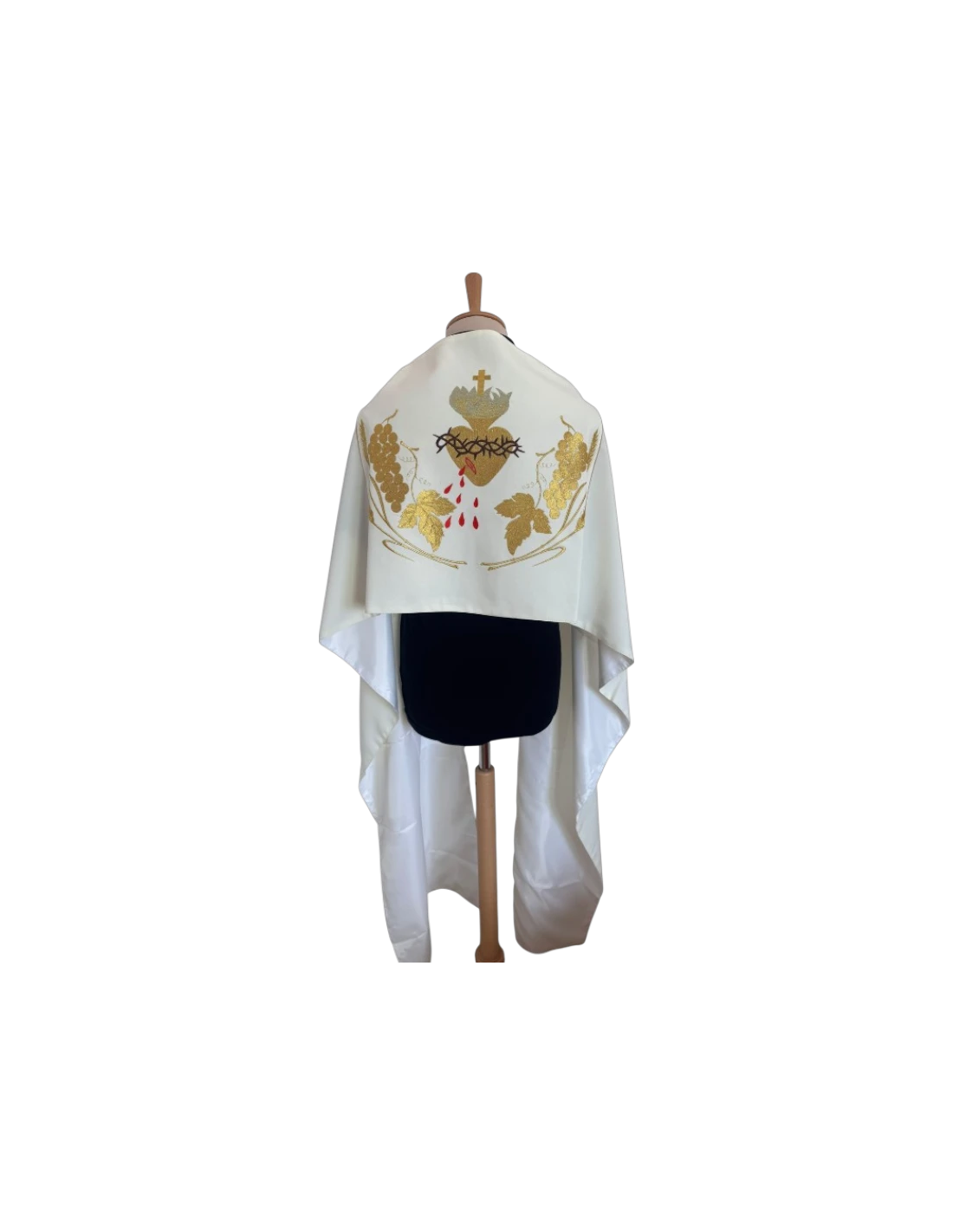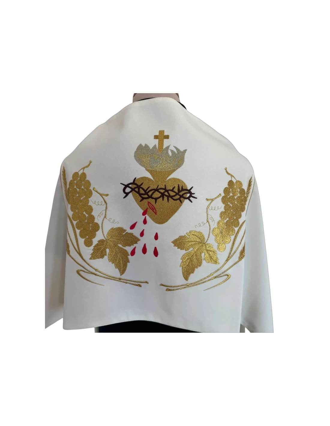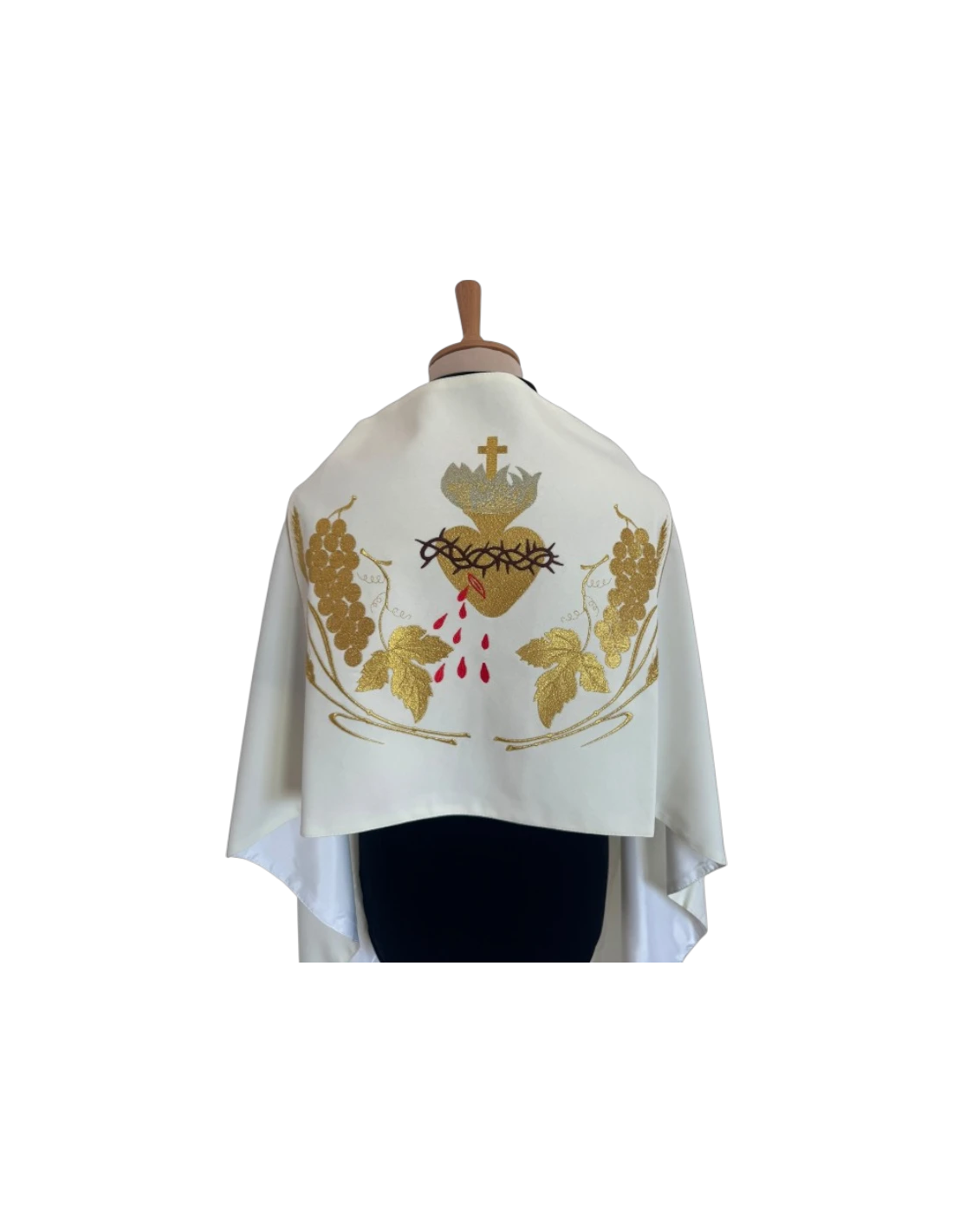 The “Sacred Heart” Shoulder Veil is a liturgical garment of deep devotion, made in white color and decorated with a gold embroidered Sacred Heart of Jesus, from which blood flows as a symbol of His redemptive sacrifice. This central image represents the sacrificial love of Christ, present in the Eucharistic mystery.