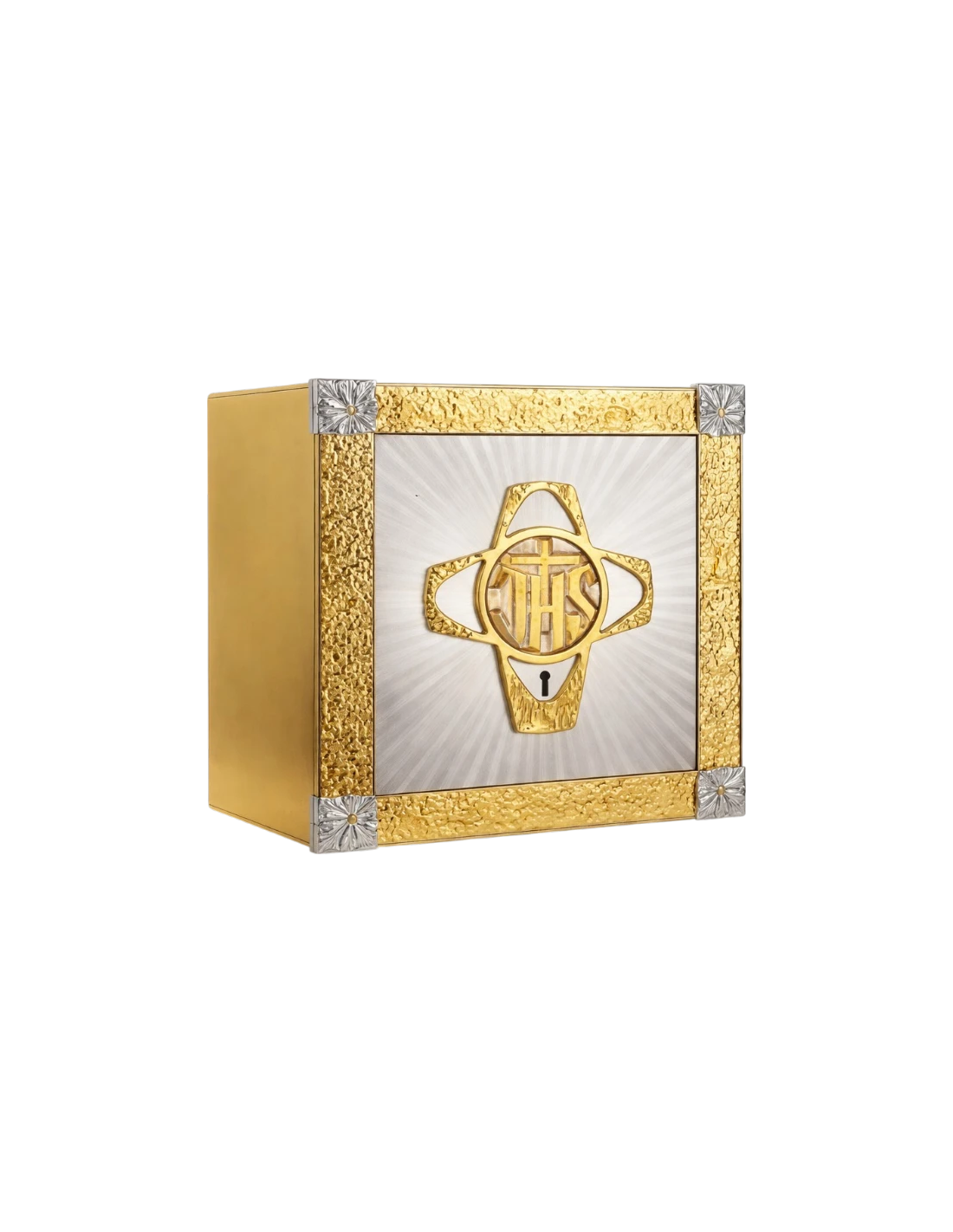 The “JHS Cross” Tabernacle stands out for its sober and elegant design, centered around a cross-shaped motif that frames the JHS monogram, symbol of the Holy Name of Jesus and of the Eucharistic presence. Its balanced composition and radiant finish make it a spiritually meaningful piece, ideal for enhancing the altar and the sacred space.