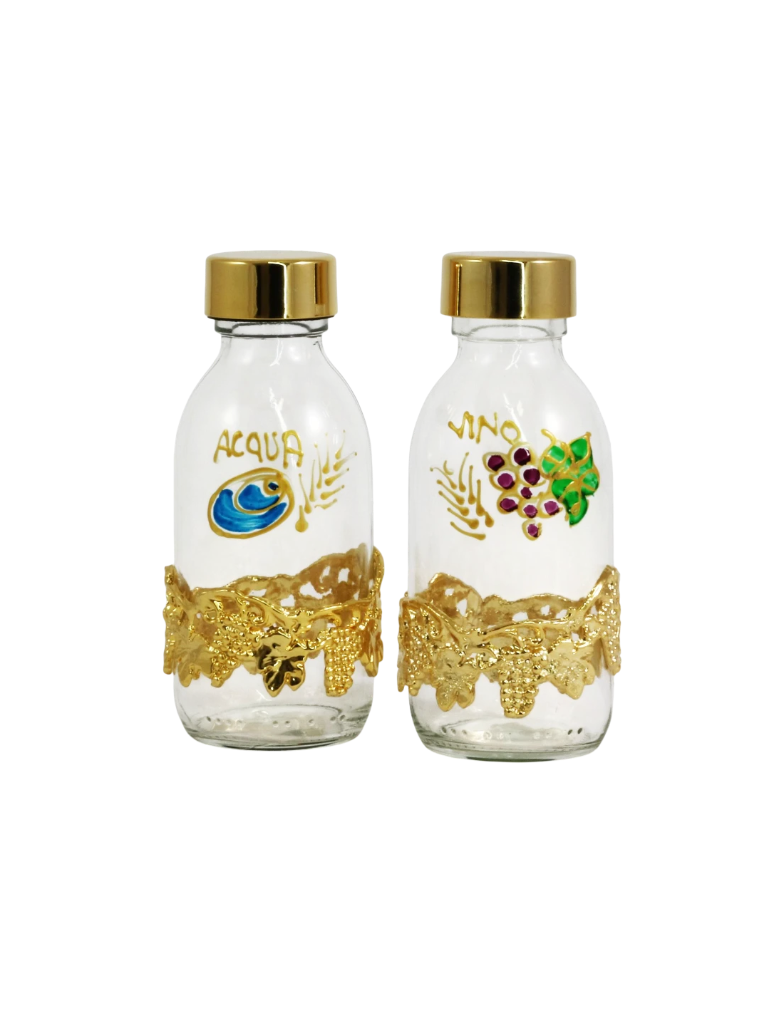 Estas botellas litúrgicas para agua y vino destacan por su estética solemne y simbólica. Están fabricadas en vidrio transparente y rematadas con una ghiera (boca) en fusión metálica con acabado dorado, decorada con elegantes motivos en relieve de uvas y hojas de vid.
