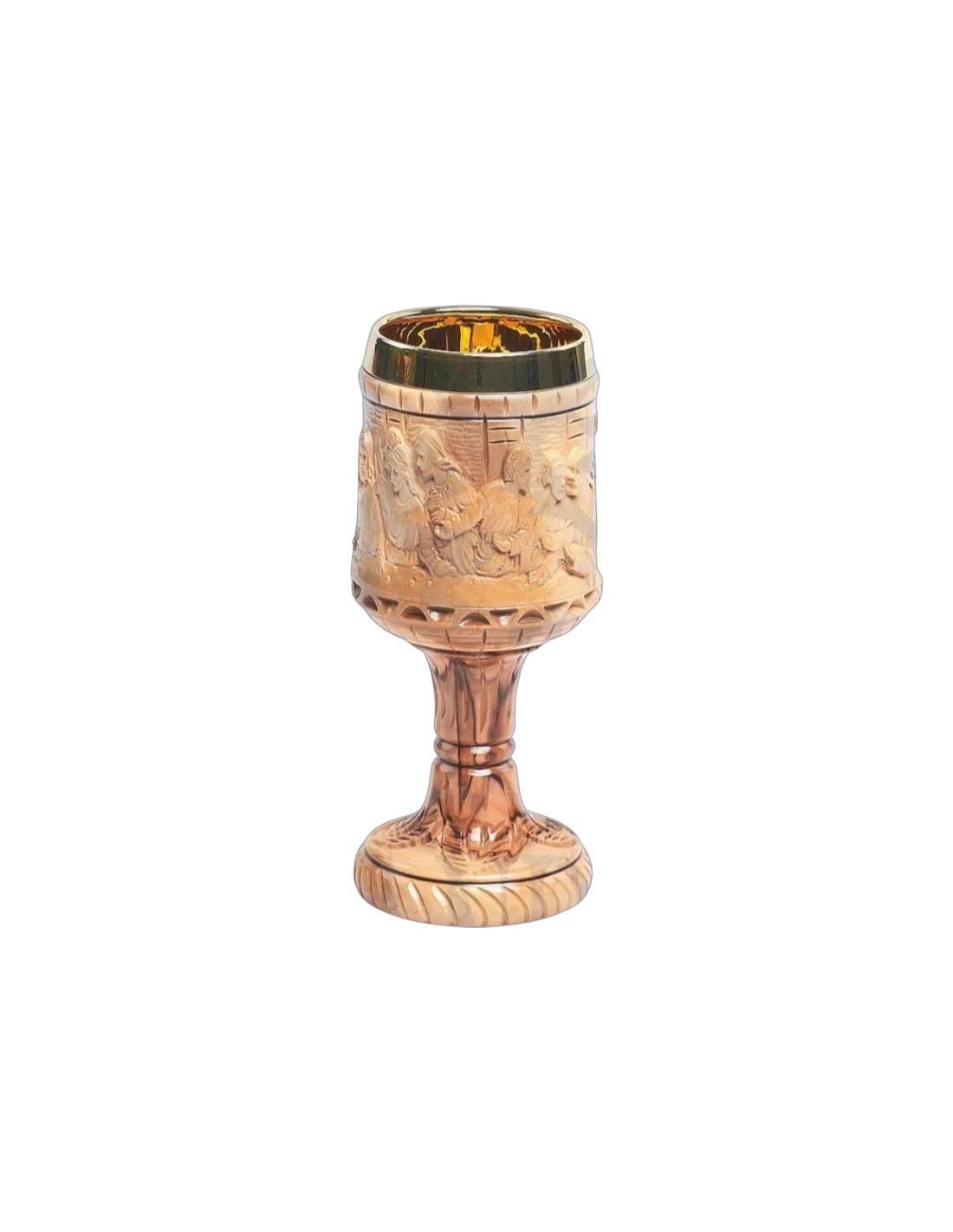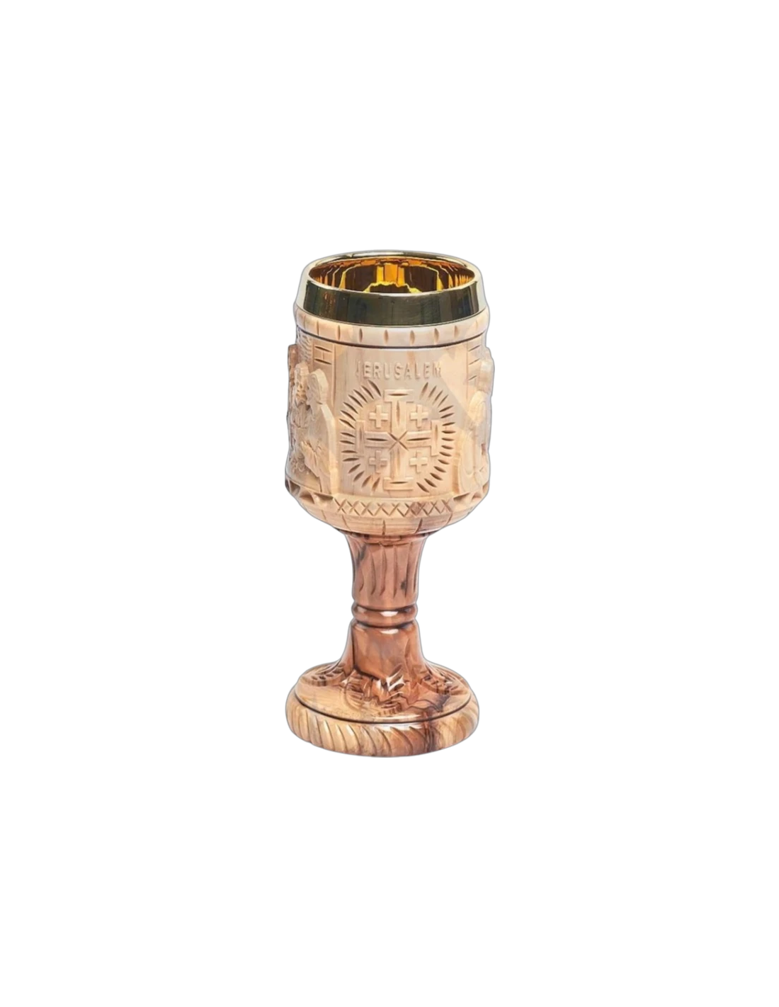 El cáliz de olivo de Calandrini es una pieza excepcional que combina la calidez de la madera de olivo con la nobleza del metal dorado.