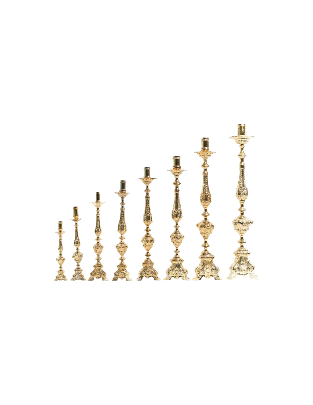 Candelabros barrocos dorados, de inspiración clásica y fabricación italiana en bronce o latón de alta calidad. Disponibles en múltiples alturas, desde los 40 cm hasta los 140 cm, son ideales para cualquier altar o ceremonia solemne. *También se pueden realizar con acabado Niquelado, simplemente indícanoslo al realizar el pedido. El precio NO varía según el acabado.
