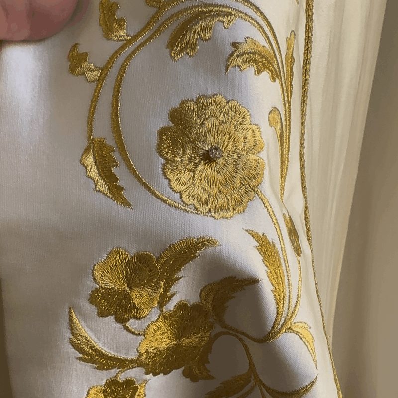 Esta capa pluvial se distingue por la pedrería cuidadosamente cosida a mano, presente tanto en los galones como en el capillo. Está realizada en tela de algodón, lo que le confiere una caída suave y elegante, ideal para un uso cómodo y solemne.