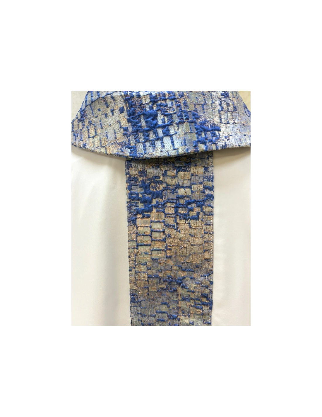 - Cuello: Presenta un acabado con relieve textil, que añade carácter y continuidad al diseño de la casulla.