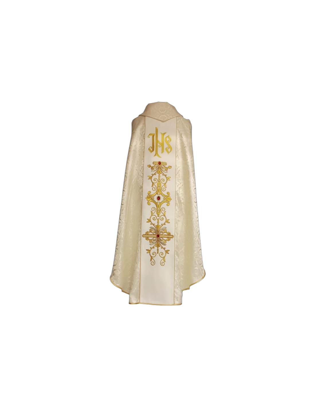 Una casulla que une devoción, elegancia y riqueza ornamental, perfecta para quienes buscan una vestidura litúrgica distinguida, luminosa y cargada de significado espiritual.