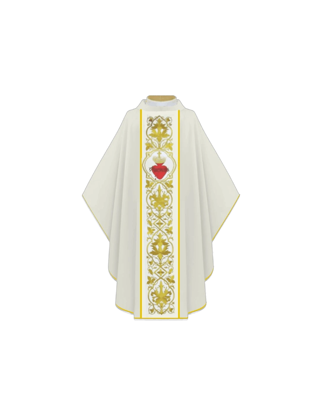 Casulla Corazón de Jesús en blanco con bordado dorado Elegante casulla de poliéster con estolón central ornamental y la imagen del Sagrado Corazón de Jesús, símbolo de amor y devoción. Ideal para celebraciones solemnes y fiestas dedicadas al Sagrado Corazón.