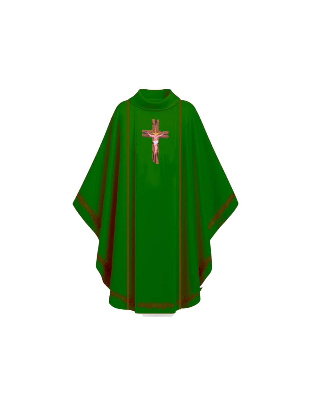 Casulla “Espinas del Señor” disponible en los cuatro colores litúrgicos, con bordado de espinas alrededor del borde, Cristo en la cruz en la parte frontal y JHS en la parte posterior. Forradas en el interior.