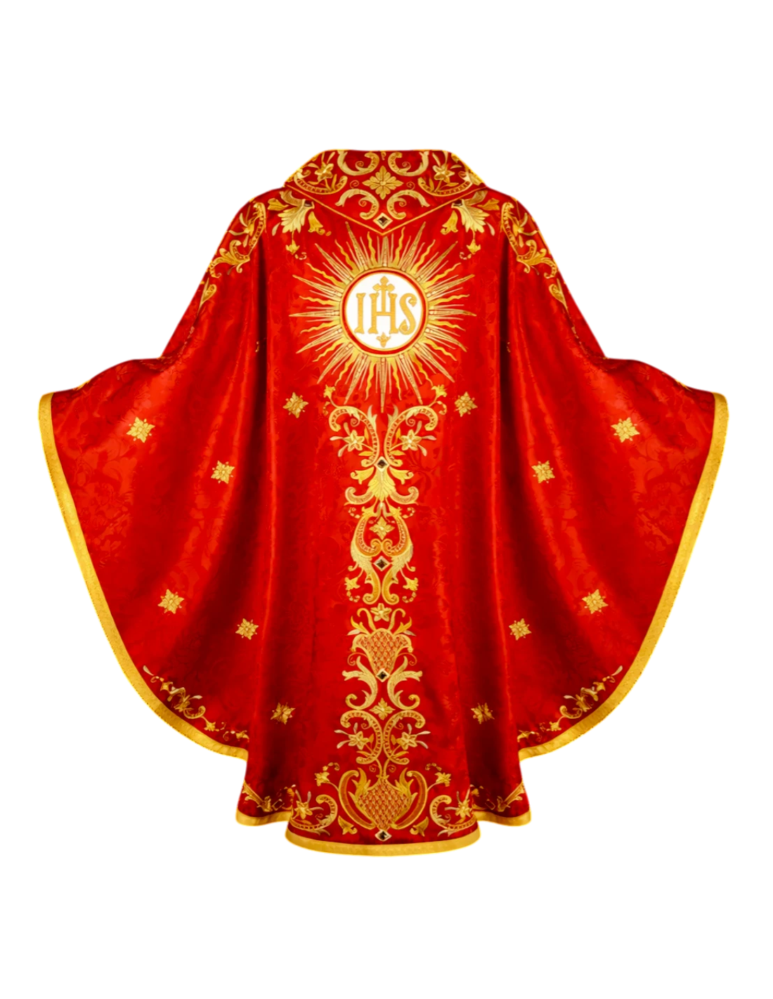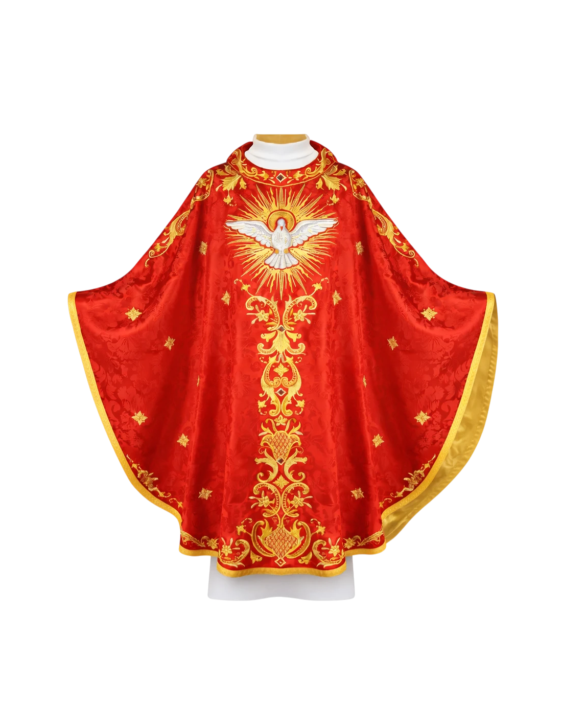 La Casulla Pentecostés Premium es una obra maestra de la artesanía litúrgica, diseñada para celebrar con solemnidad Pentecostés y la Confirmación. Confeccionada en tejido jacquard rojo de alta calidad, esta casulla combina elegancia y devoción en cada detalle, destacando un bordado del Espíritu Santo en hilo de oro y motivos florales que simbolizan el fuego sagrado.