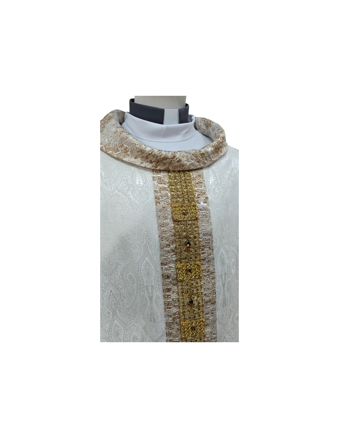 De origen italiano, esta casulla refleja la tradición textil y litúrgica de uno de los referentes mundiales en arte sacro. Cada detalle ha sido cuidadosamente trabajado, desde la pedrería aplicada a mano hasta la pasamanería, garantizando una pieza única y duradera.