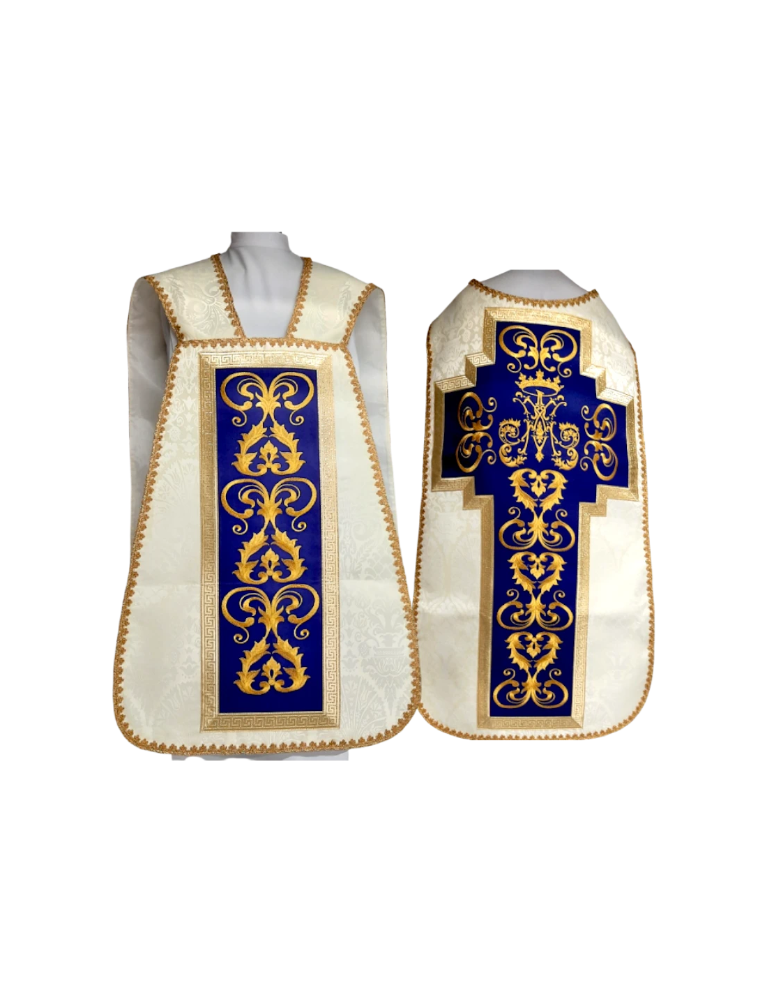 Una elegante casulla de corte romano que honra a la Santísima Virgen, con un diseño sobrio y devocional.