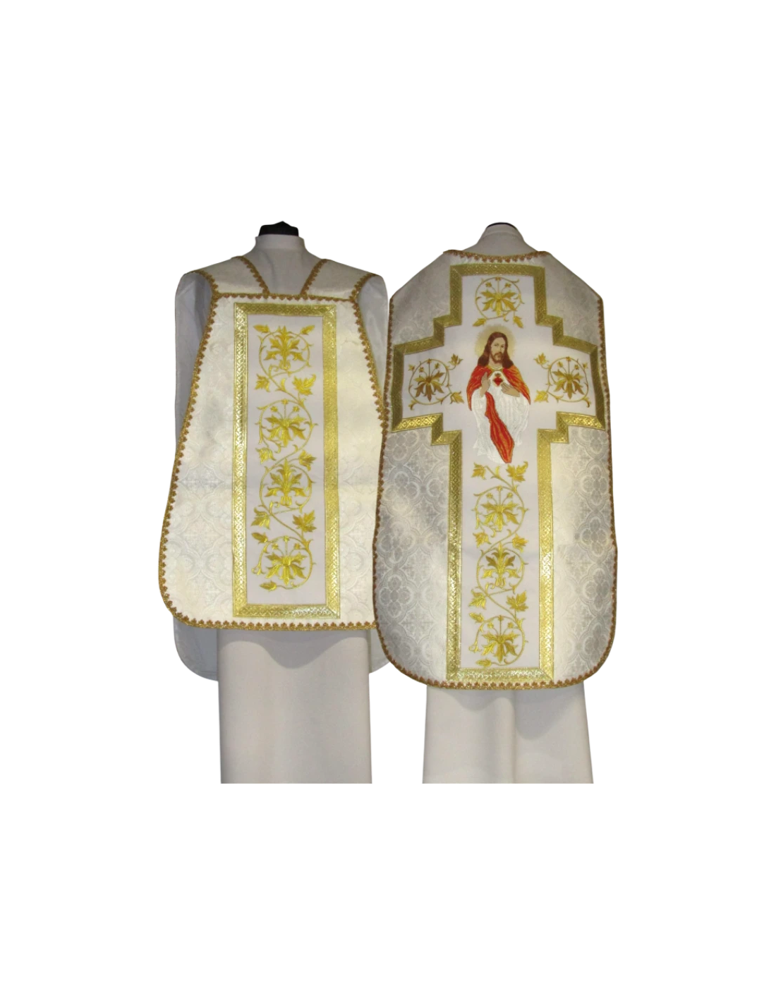 Una solemne casulla Romana del corazón de Jesús, disponible también en rojo, consultános para cualquier duda.