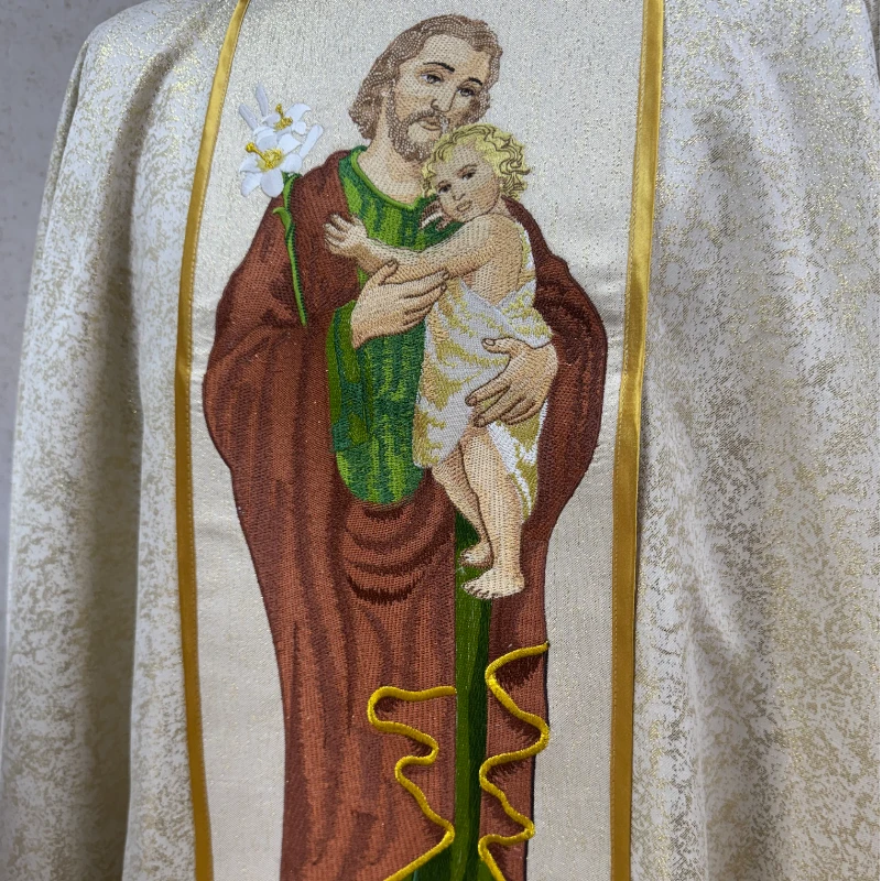 Exclusiva Casulla de San José con bordado de alta fidelidad y detalles dorados.