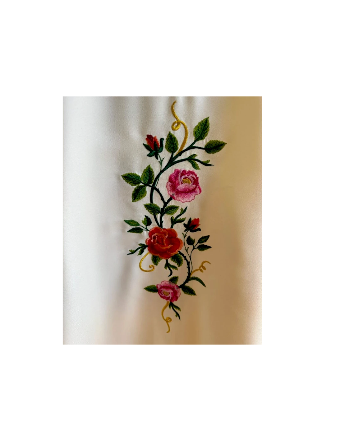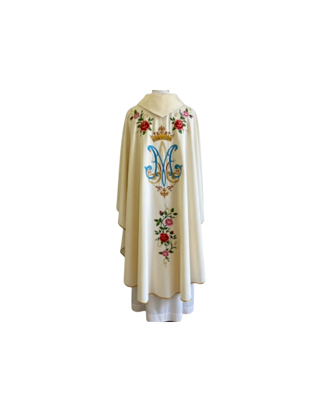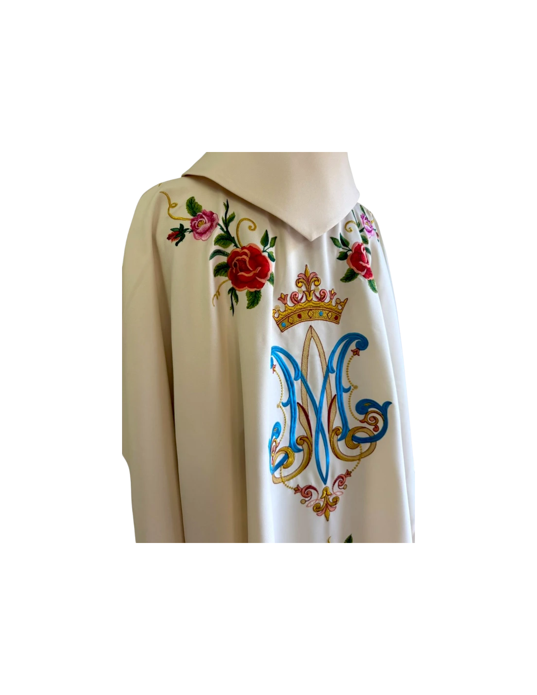 Todo el conjunto está realzado por un estolón bordado, con detalles en oro y flores simbólicas que evocan el Tepeyac. El tejido en color crema litúrgico otorga sobriedad y delicadeza, permitiendo que el bordado brille con total protagonismo.
