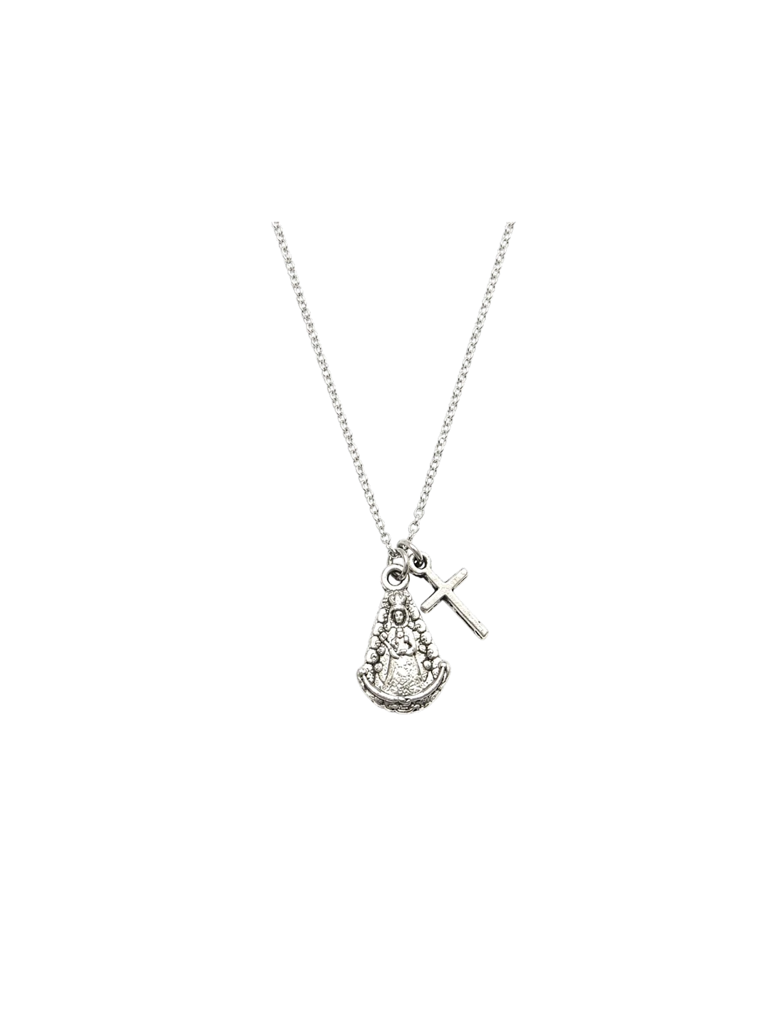 Collar Virgen del Rocío y cruz de 17 mm chapado en plata, con gran valor espiritual y diseño elegante. Ideal para uso diario o regalo religioso