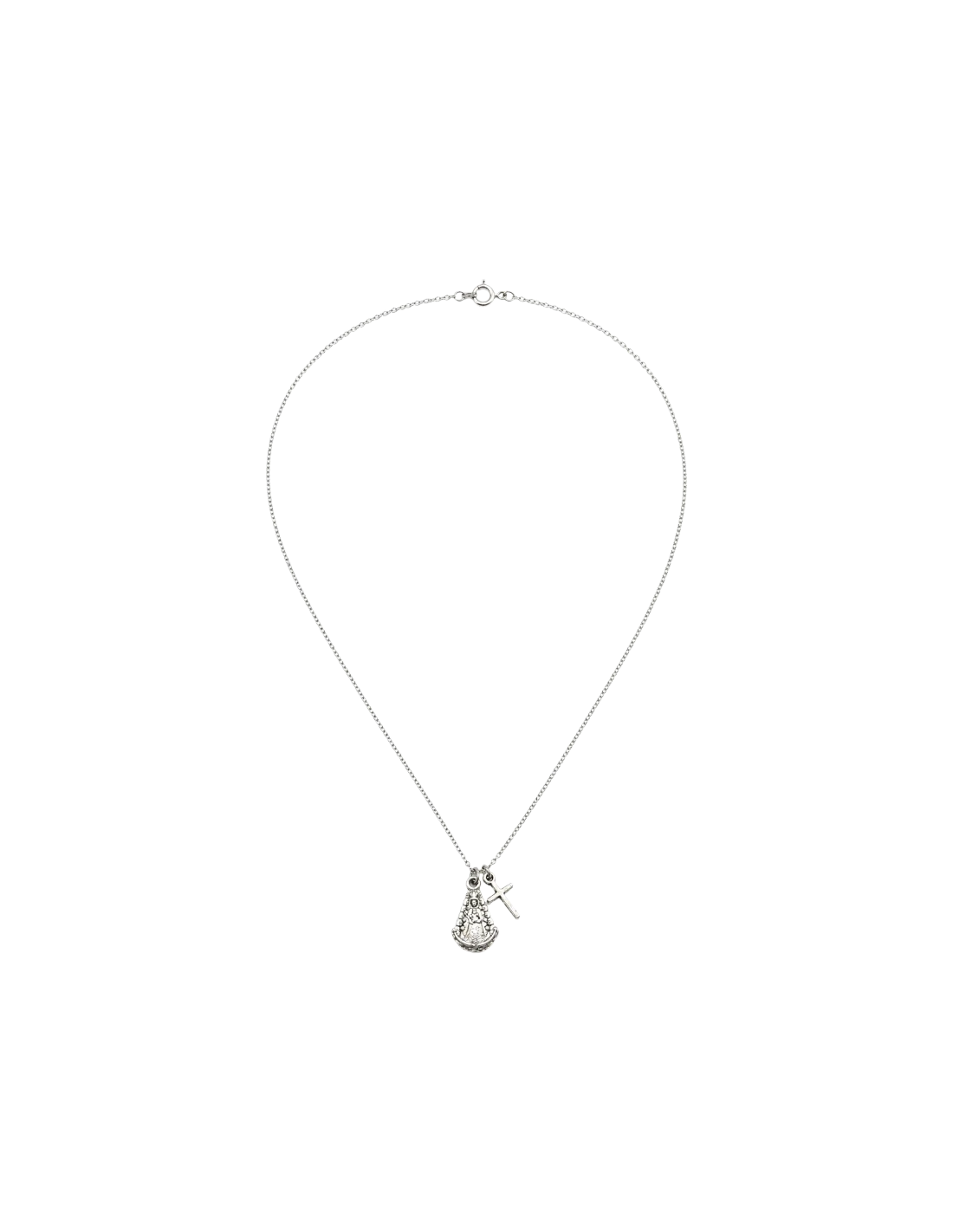Este collar religioso combina dos elementos esenciales: la imagen de la Virgen en relieve y una pequeña cruz colgante, creando una pieza elegante y llena de simbolismo. Su tamaño lo hace perfecto para llevar a diario con discreción y estilo.