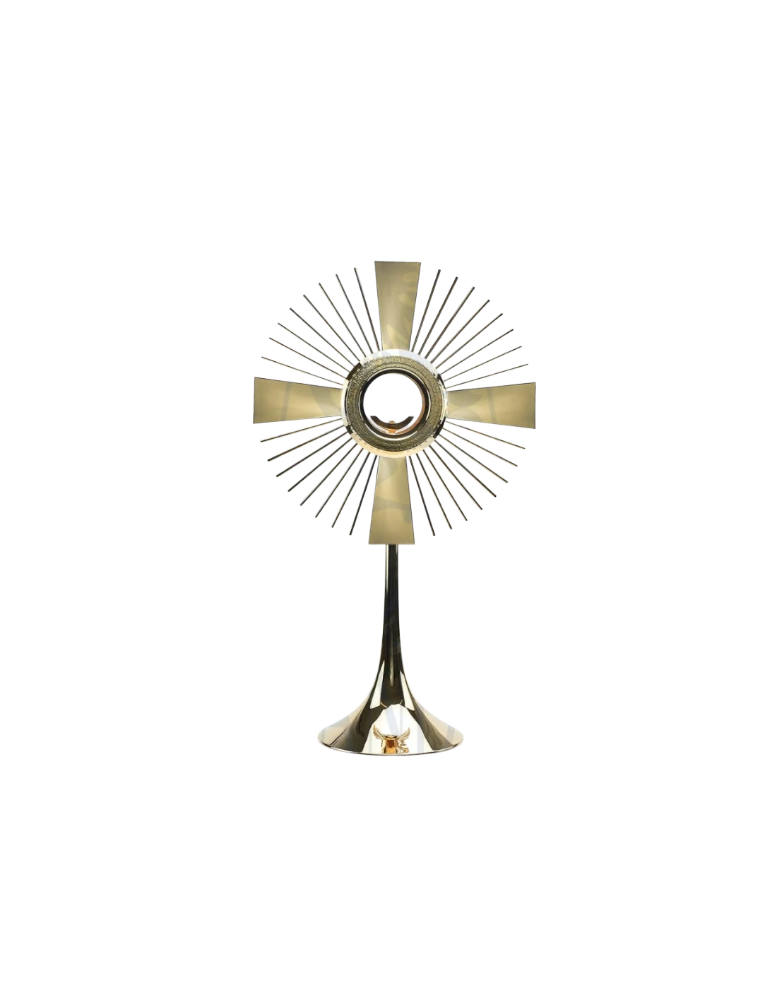 La Custodia Moderna es una pieza clásica de estilo sobrio y refinado, diseñada para la adoración del Santísimo Sacramento. Está realizada íntegramente en latón, con base fundida y acabado en oro puro, lo que le confiere solidez, brillo y dignidad litúrgica. Disponible en dos versiones: estándar y para hostia magna.