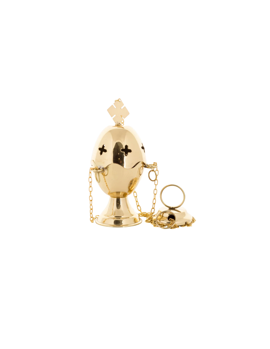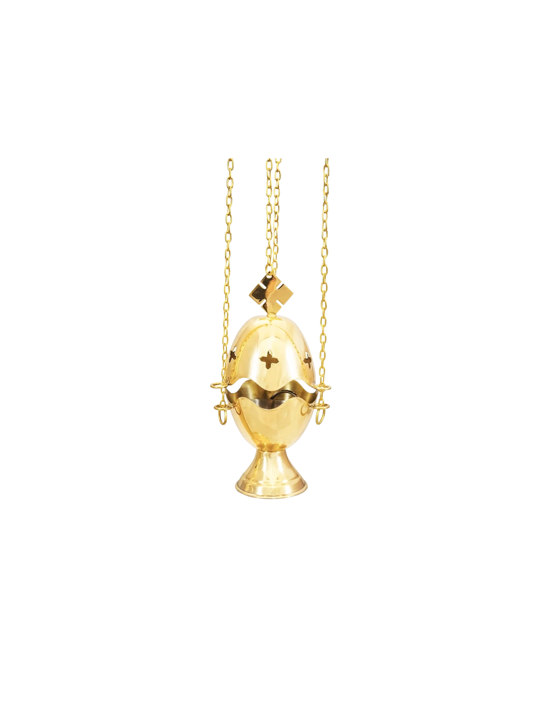 Incensario Mediano "Cruz" fabricado en latón con baño de oro de alta calidad. Con una altura de 16 cm y un diseño calado de cruces, ofrece una combustión óptima y una estética solemne. Incluye cadenas de 65 cm para un manejo cómodo y seguro, disponible **solo en dorado**.