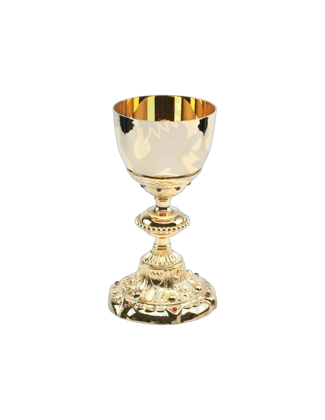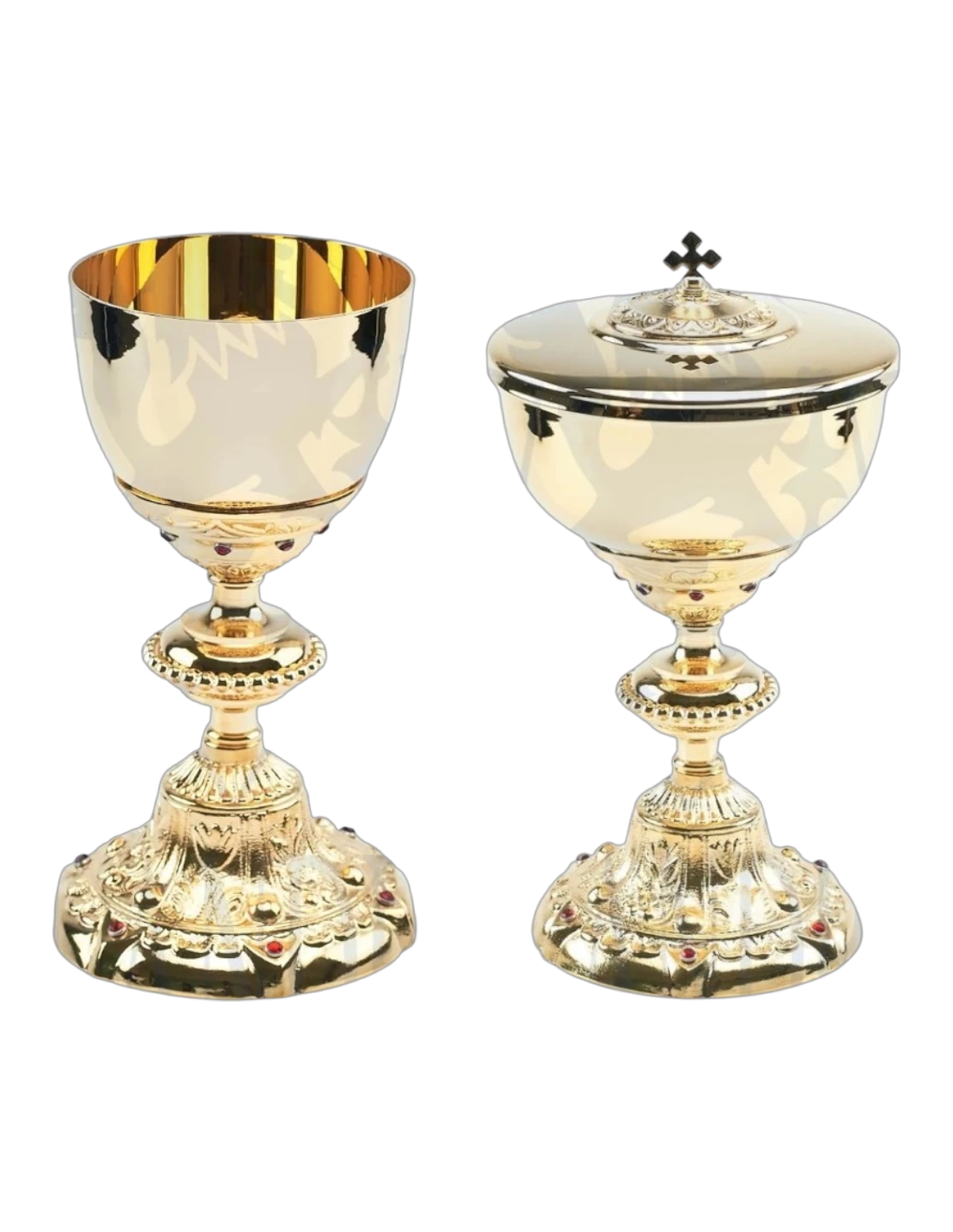 El Juego Litúrgico Barroco con Insertos Rojos está compuesto por un cáliz y un copón de diseño armonizado, elaborados en metal con acabado dorado brillante. Con un estilo rico en ornamentación barroca e insertos decorativos de color rojo —no rubíes reales—, este conjunto es perfecto para celebraciones solemnes que buscan realzar la belleza del rito.