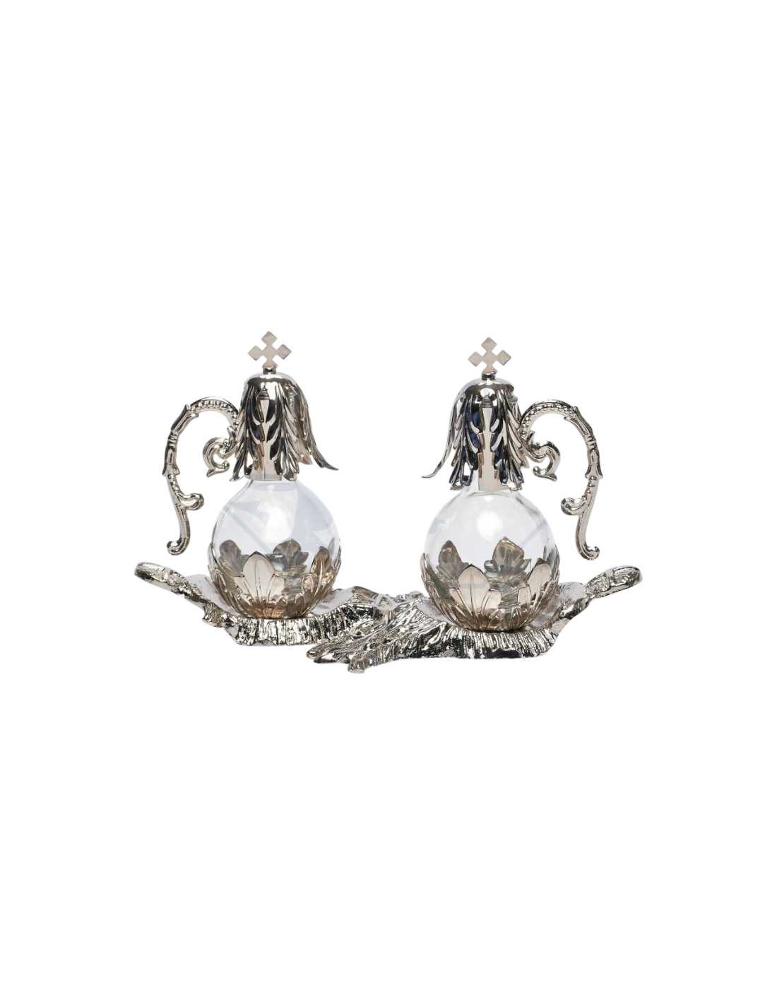 Preciosas vinajeras con decoración excepcional. Juego de 2 vinajeras de 100cc y bandeja. También disponibles en plateado.