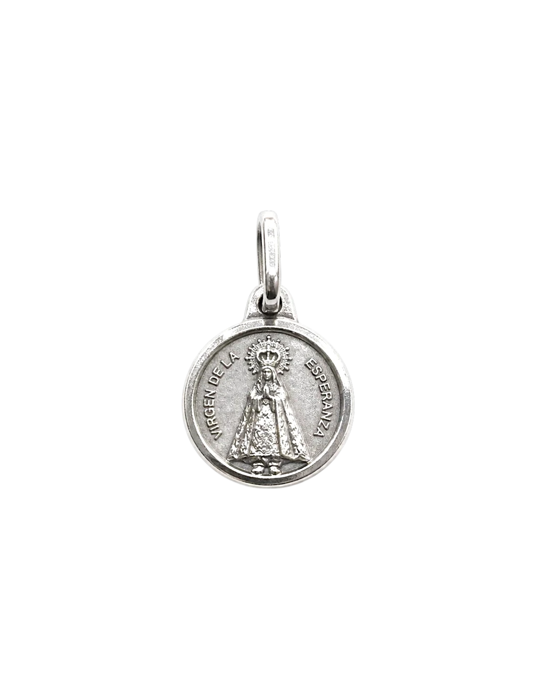 Medalla Virgen de la Esperanza en plata de 11 mm. Diseño delicado, elegante y con gran significado espiritual.