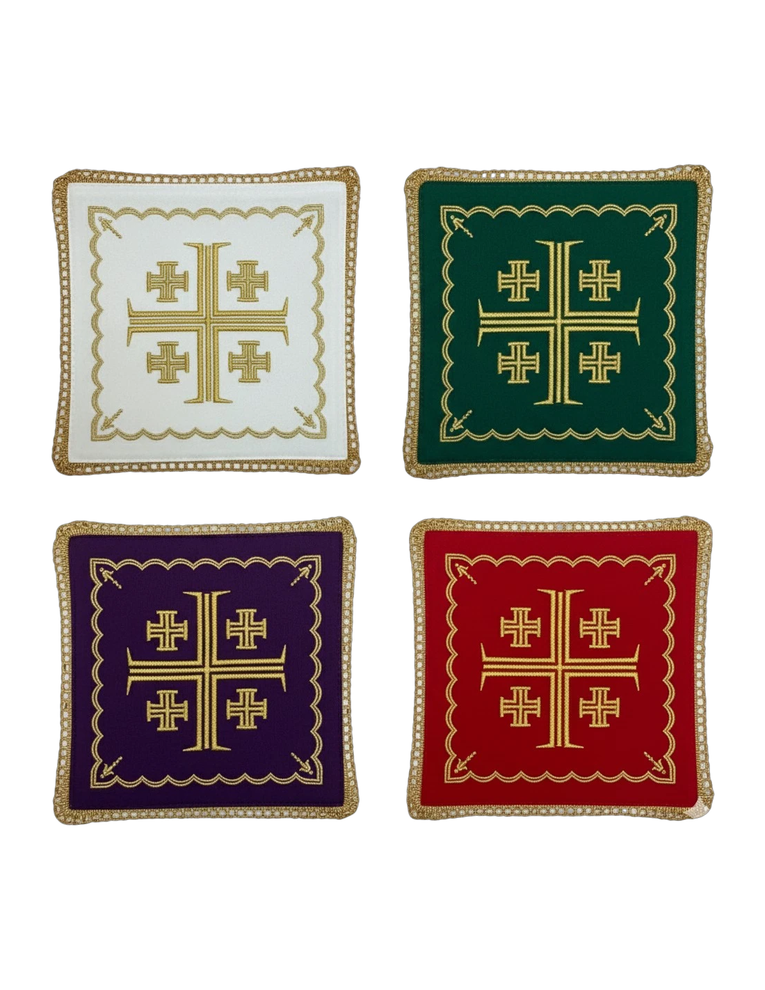 Adquiera la distinción y el simbolismo con nuestra colección de palias sacerdotales con la Cruz de Jerusalén, disponibles en los cuatro colores litúrgicos esenciales. Estas palias son un homenaje a la Tierra Santa y una elección de profunda fe, perfectas para acompañar el calendario litúrgico.