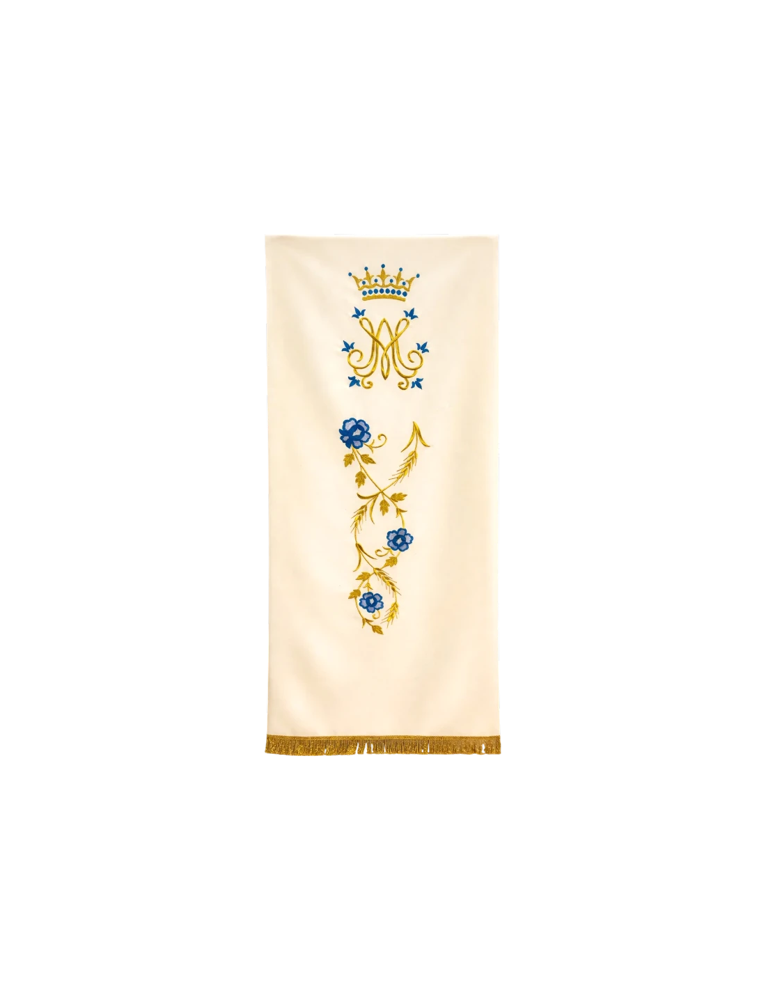 Paño de Atril Mariano en blanco roto con anagrama mariano bordado, delicadas rosas azules y elegantes flecos dorados.