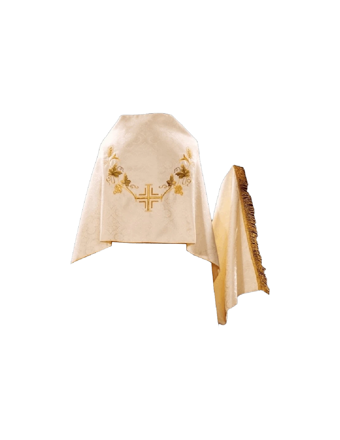 Hermoso paño de hombtos, con tela brocada y bordado de cruz y espigas.