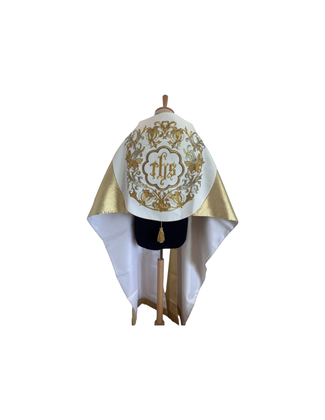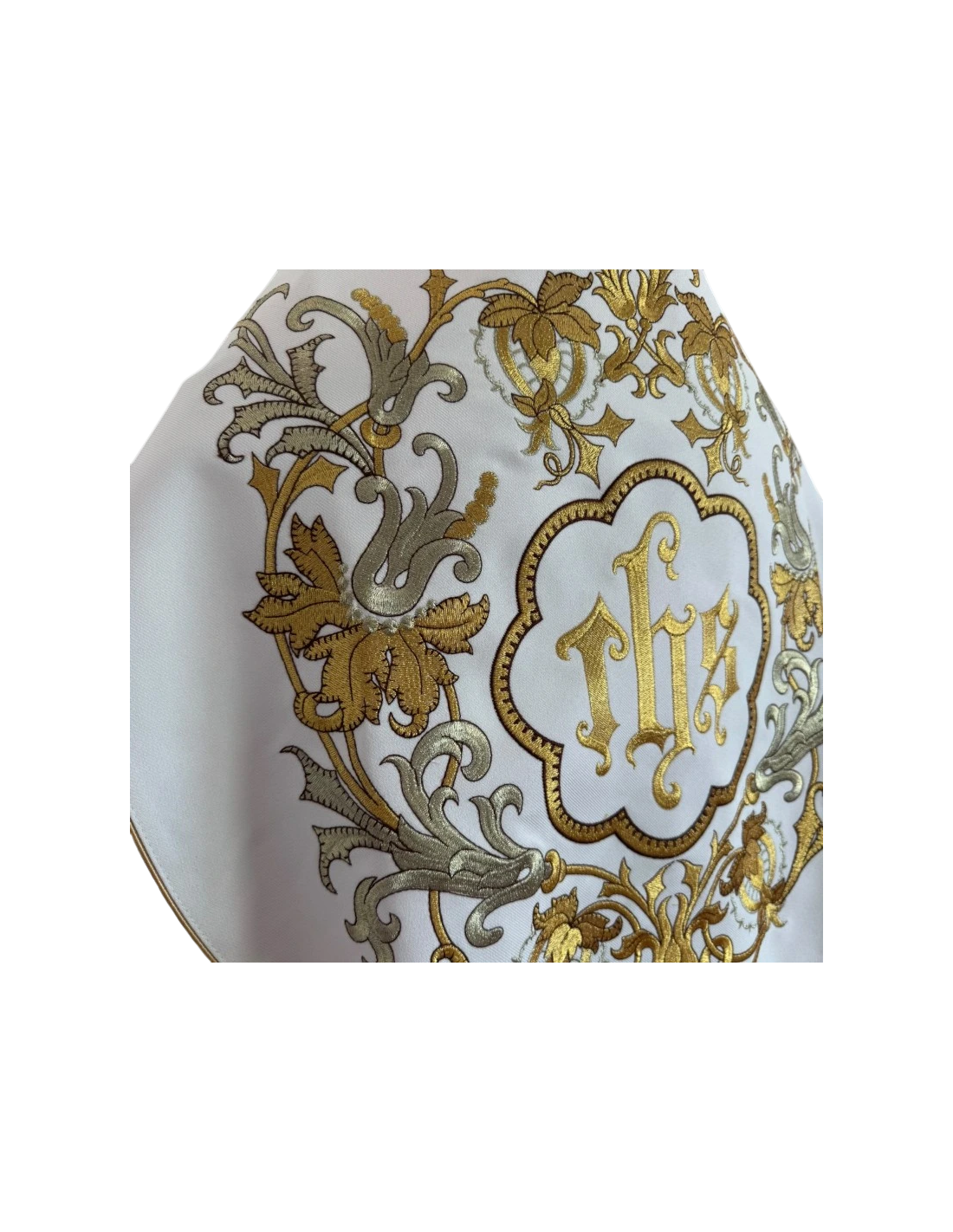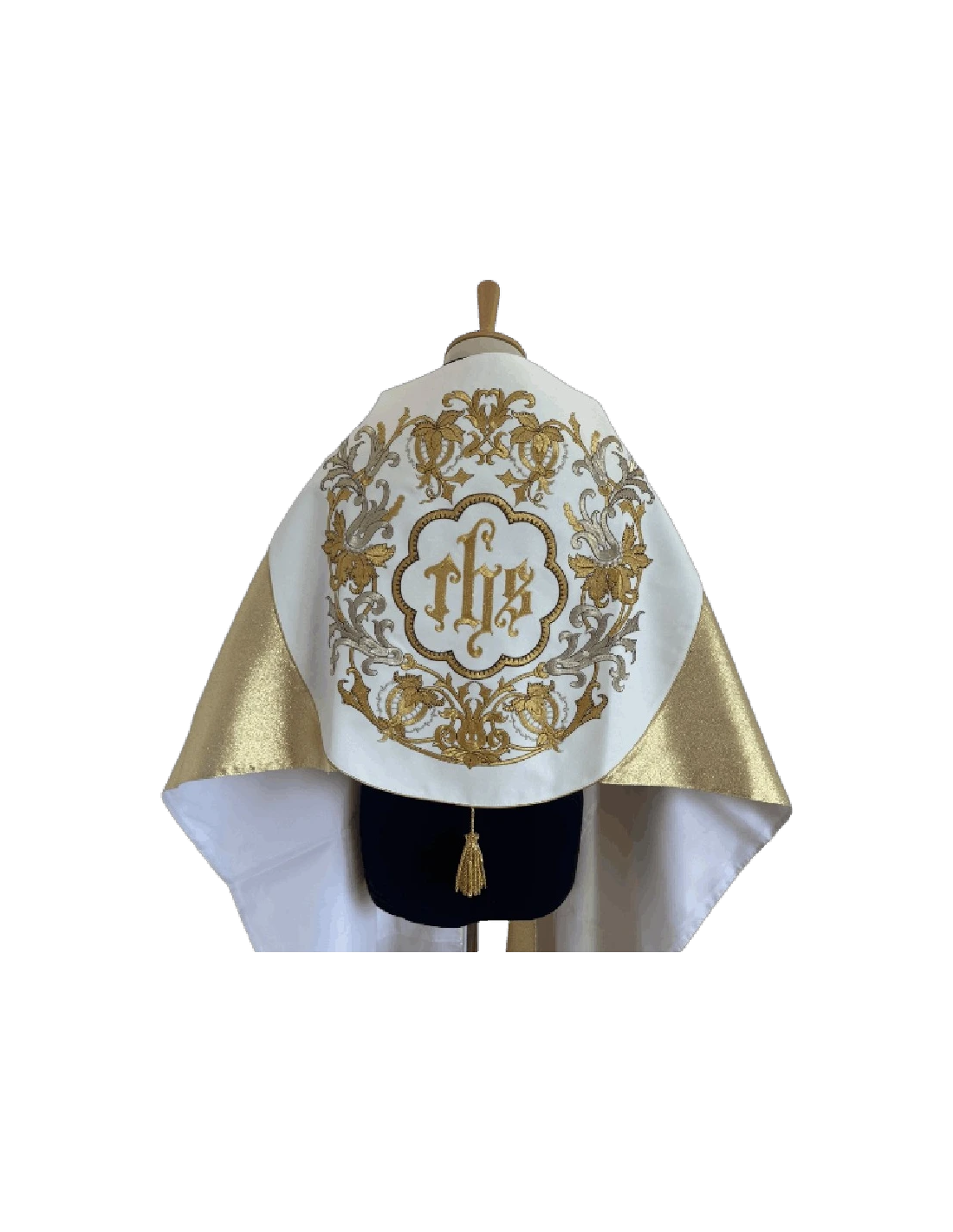 El Paño de Hombros JHS Dorado es una prenda litúrgica de gran solemnidad, diseñada para el uso en bendiciones con el Santísimo Sacramento y procesiones eucarísticas. Confeccionado en tisu dorado, destaca por su brillo elegante y su ligereza, y presenta un capillo blanco con el monograma JHS bordado en dorado, símbolo tradicional del Santo Nombre de Jesús.