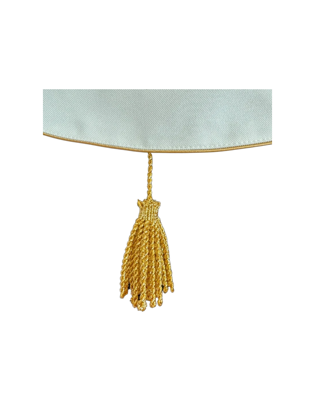 Un Bordado exquisito, el capilo está acompañado de una borla, y al finalizar el paño, encontramos flecos, el tejido es tisú dorado.