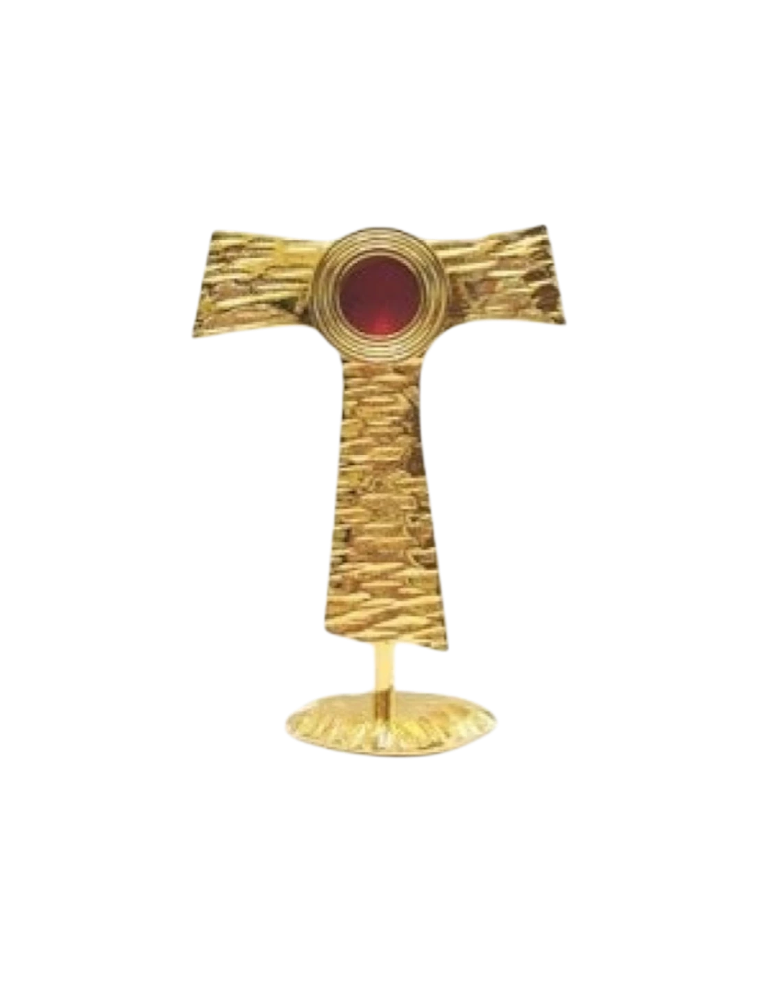 Este relicario en forma de cruz Tau presenta un diseño sobrio y profundamente simbólico, ideal para custodiar reliquias sagradas con reverencia y dignidad. Su acabado dorado resalta la solemnidad del objeto litúrgico, convirtiéndolo en una pieza destacada en cualquier capilla, iglesia o exposición de reliquias.