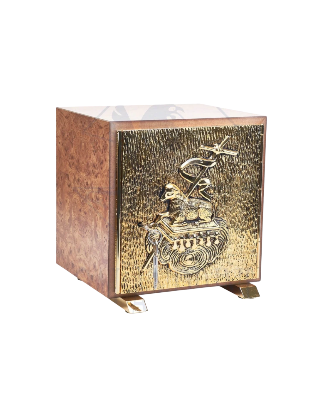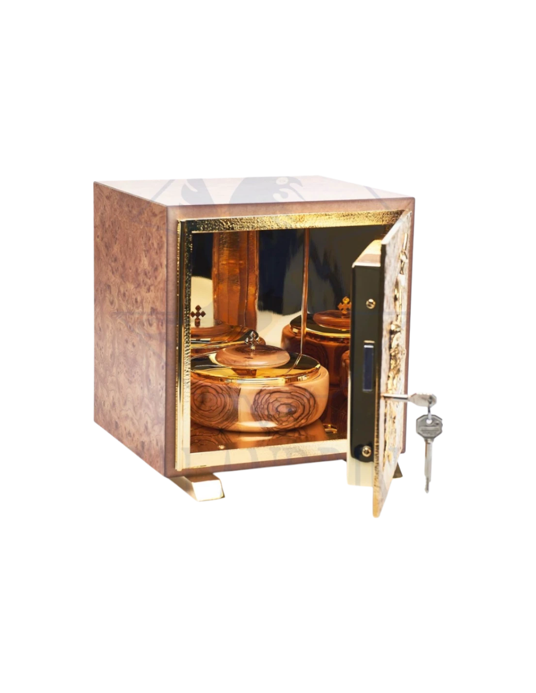 Sagrario de Madera Dorado 24K Este sagrario único está fabricado en madera noble de alta calidad con un espesor de 2 cm, recubierto internamente con una lámina de latón de 1 mm, ofreciendo solidez, protección y durabilidad excepcionales. Los acabados exteriores están disponibles en seis variantes: Oro, Abeto blanco, Granito negro, Mármol rojo, Raíz de olmo y Roble. Todos los detalles dorados están realizados con oro de 24 quilates, aportando una estética solemne y digna del Santísimo Sacramento.