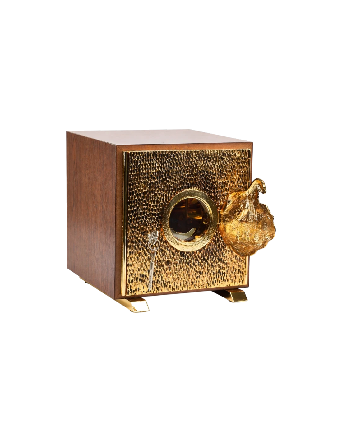 Sagrario Cordero con expositor en madera noble con interior en latón y detalles en oro de 24K. Incorpora puerta de exhibición para una adoración eucarística solemne.