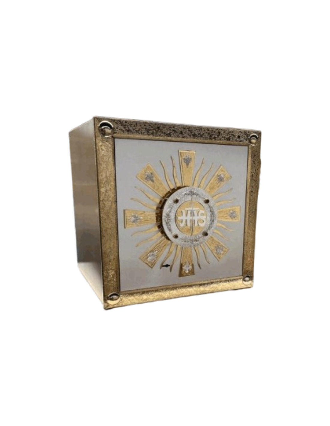 El Sagrario “Resplandor Eucarístico JHS” destaca por su imponente diseño centrado en el monograma JHS, rodeado por un resplandor radiante que simboliza la luz de Cristo presente en la Eucaristía. Su composición transmite solemnidad y profundidad espiritual, convirtiéndolo en una pieza central ideal para el altar.