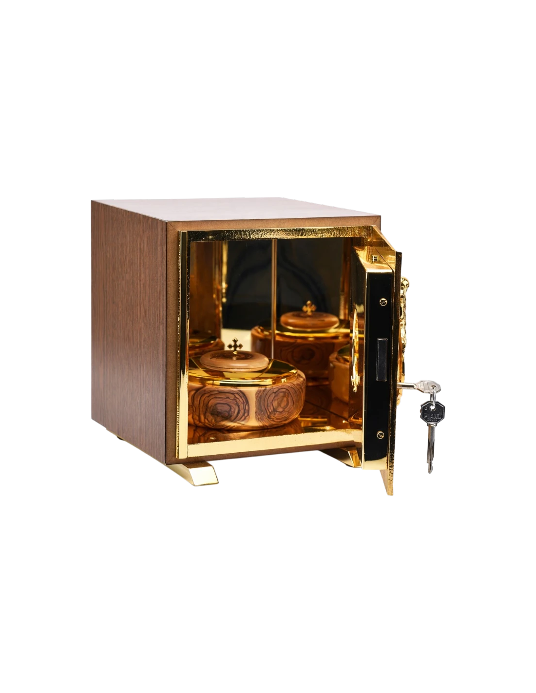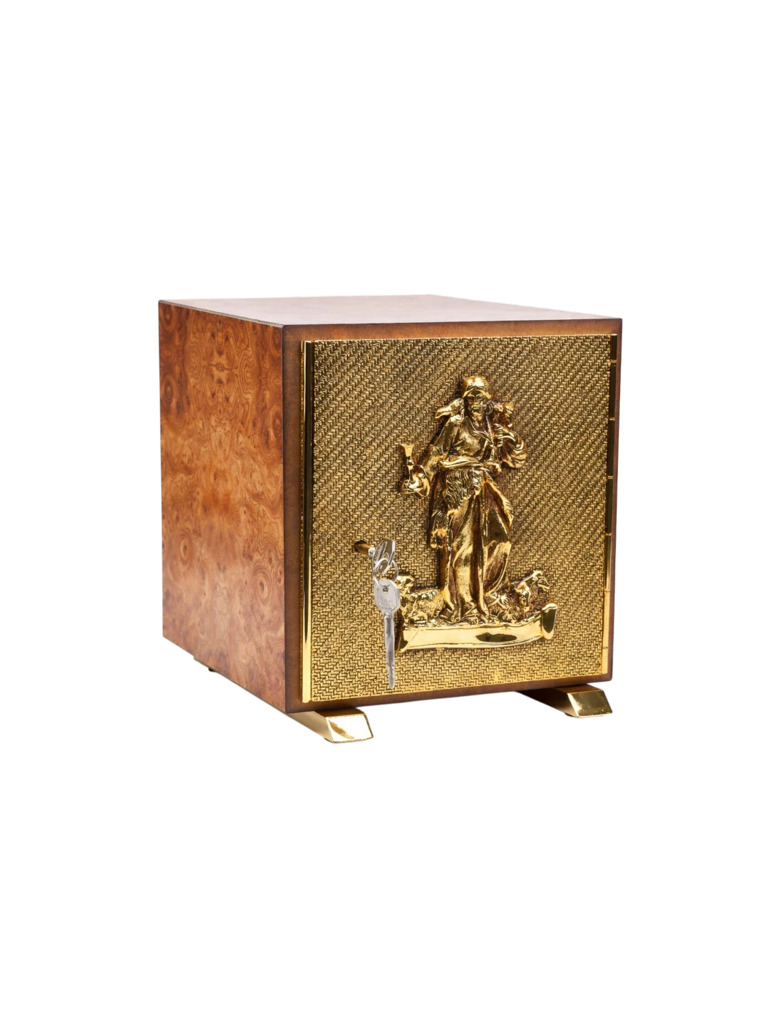 El relieve dorado, elaborado con oro de 24 quilates, aporta una estética solemne y detallada, destacando la figura central sobre un fondo texturizado que realza su presencia. Esta iconografía convierte el sagrario en una pieza de gran valor espiritual, ideal para transmitir cercanía, protección y fe en el altar.
