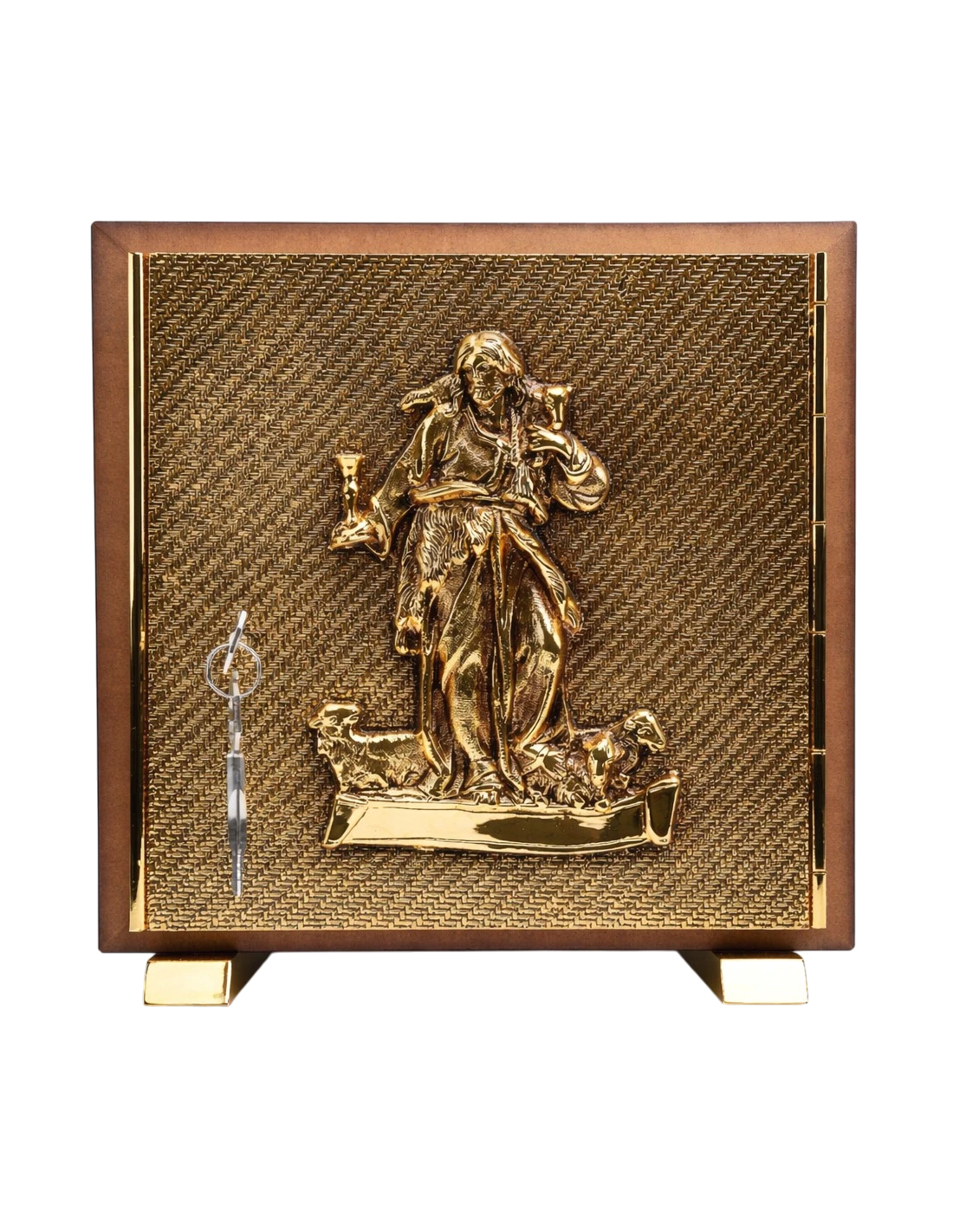 Sagrario “Jesús Buen Pastor”. Este sagrario único está fabricado en madera noble de alta calidad con un espesor de 2 cm, recubierto internamente con una lámina de latón de 1 mm, ofreciendo solidez, protección y durabilidad excepcionales. Su diseño frontal representa a Jesús como Buen Pastor, rodeado de ovejas, símbolo del cuidado, la guía y el amor de Cristo hacia su pueblo.
