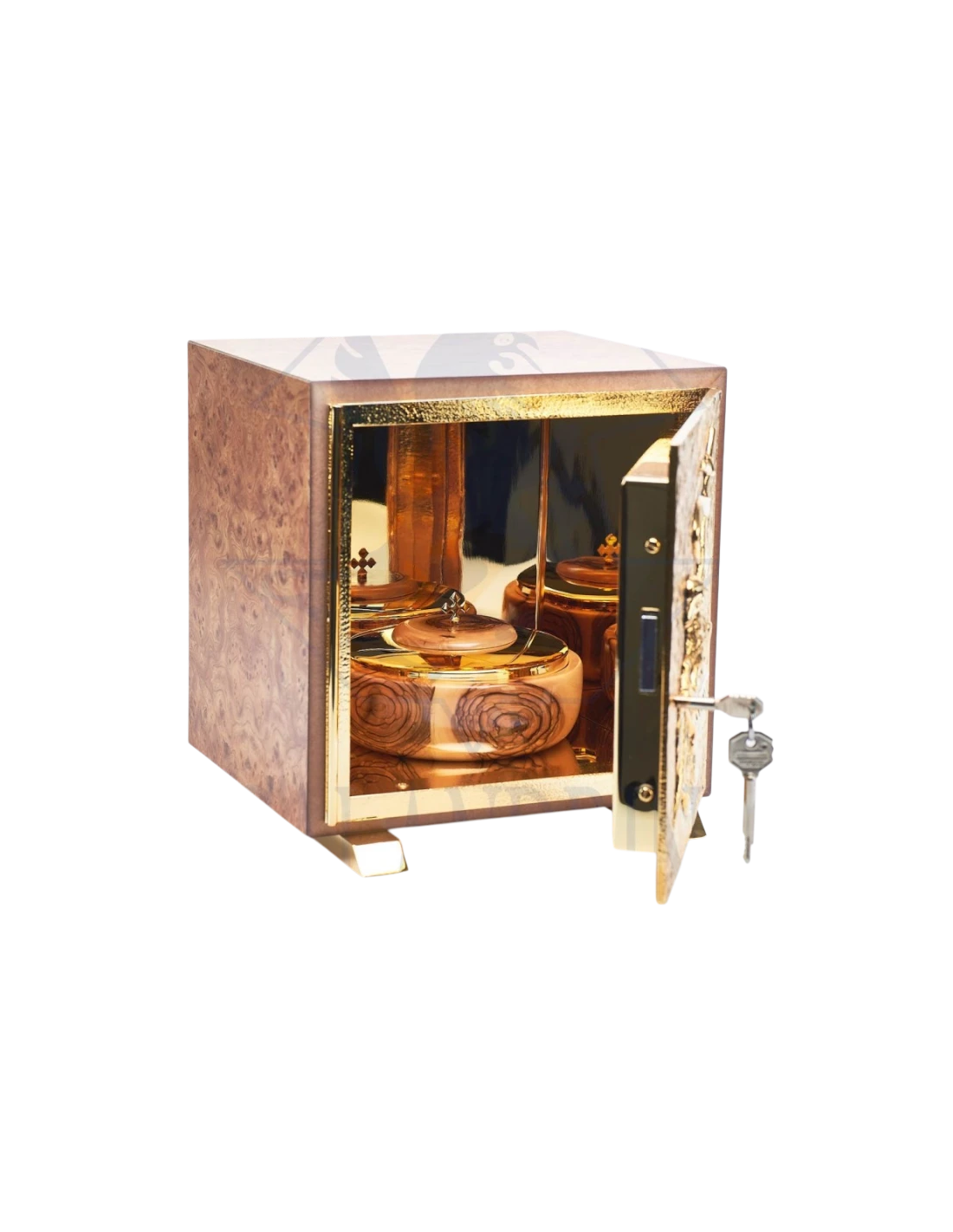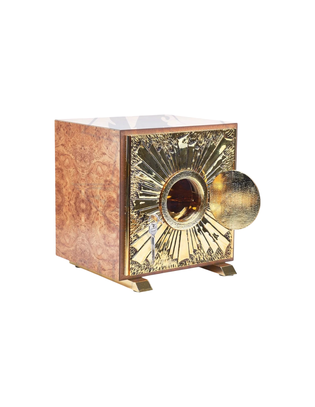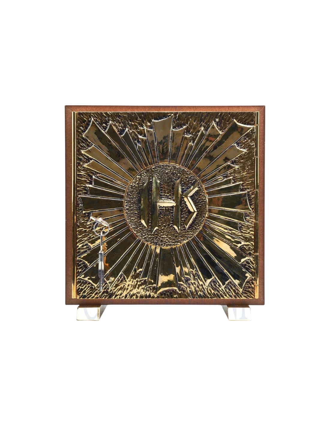 El Sagrario JHS con expositor está fabricado en madera noble de alta calidad, con un espesor de 2 cm, y recubierto internamente con una lámina de latón de 1 mm.