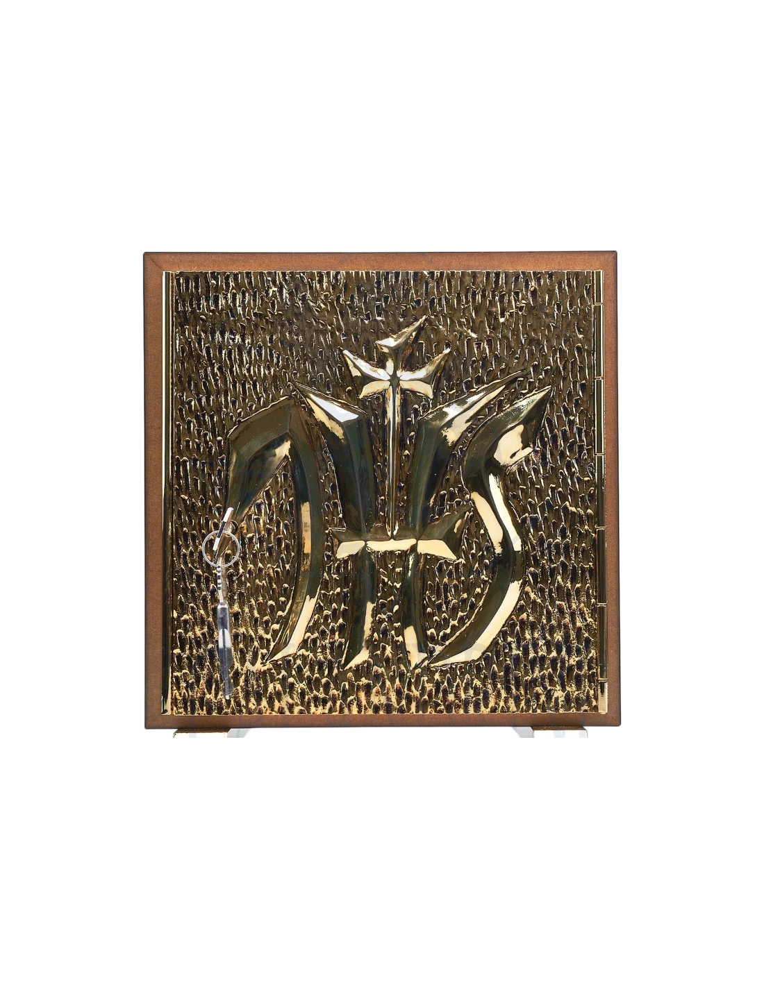 Su diseño frontal presenta el símbolo JHS en relieve, expresión clásica del Santo Nombre de Jesús y signo profundamente ligado a la presencia eucarística. La composición, sobria y elegante, resalta por sus líneas limpias y su fuerte carácter litúrgico.