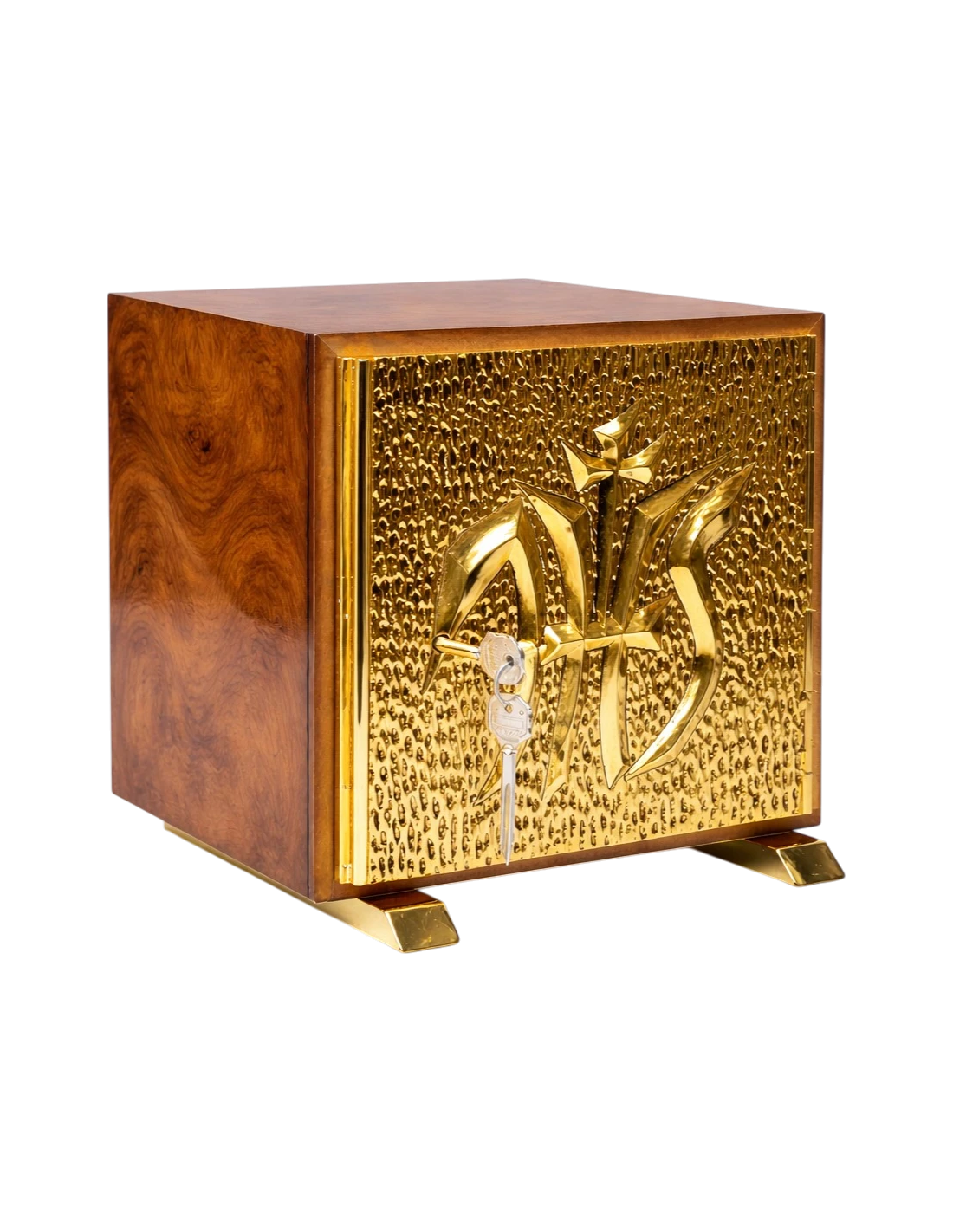 El Sagrario JHS sin expositor está fabricado en madera noble de alta calidad, con un espesor de 2 cm, y recubierto internamente con una lámina de latón de 1 mm, lo que le confiere solidez, protección y gran durabilidad.