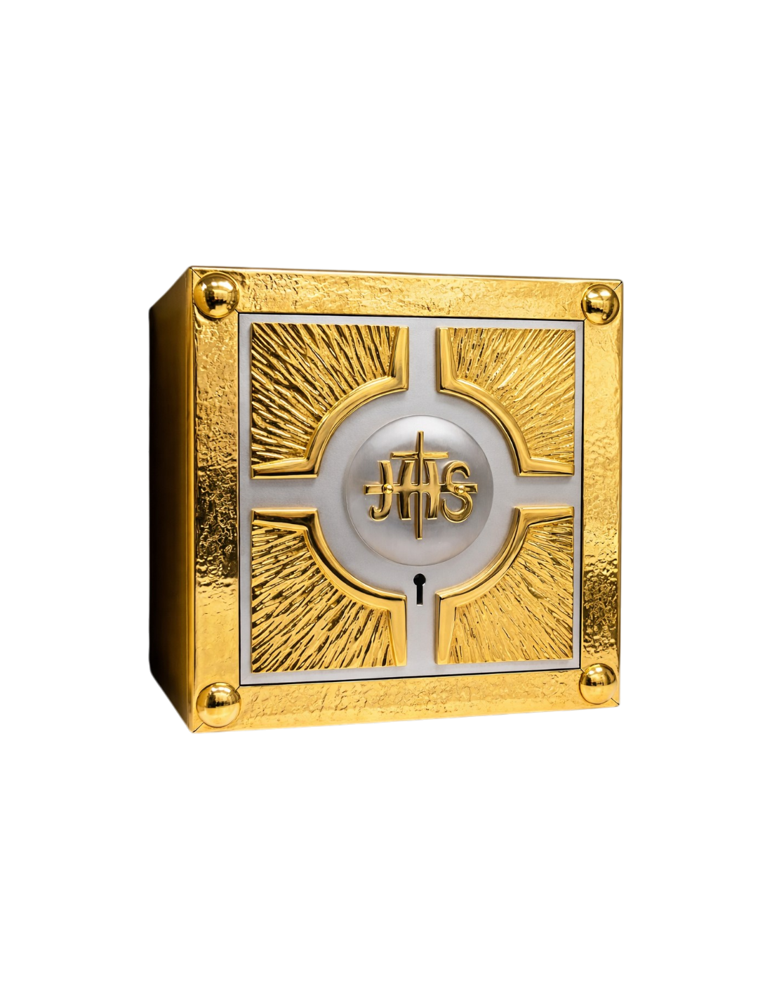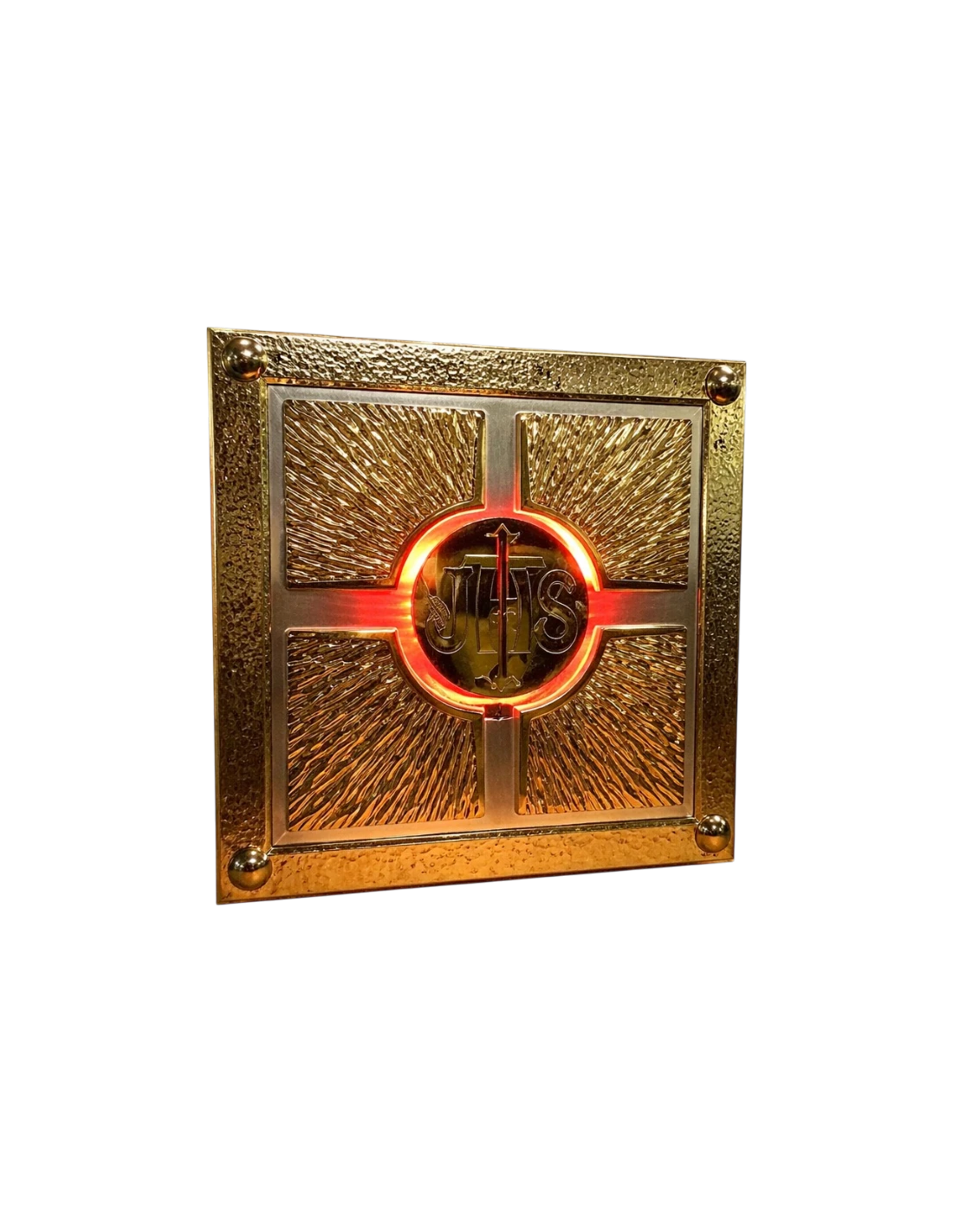 El Sagrario “Resplandor JHS” LED conserva la fuerza simbólica del diseño radiante centrado en el monograma JHS, y la realza con una iluminación LED integrada que aporta profundidad, calidez y una presencia visual aún más solemne. La luz enmarca el centro del sagrario y subraya el carácter sagrado de la pieza, evocando la luz de Cristo presente en la Eucaristía.