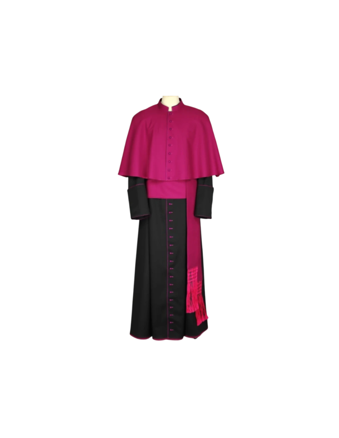 En la imagen de muestra se presenta la sotana ribeteada acompañada de fajín y esclavina, los cuales no están incluidos en el precio. Esta ficha corresponde exclusivamente a la sotana.