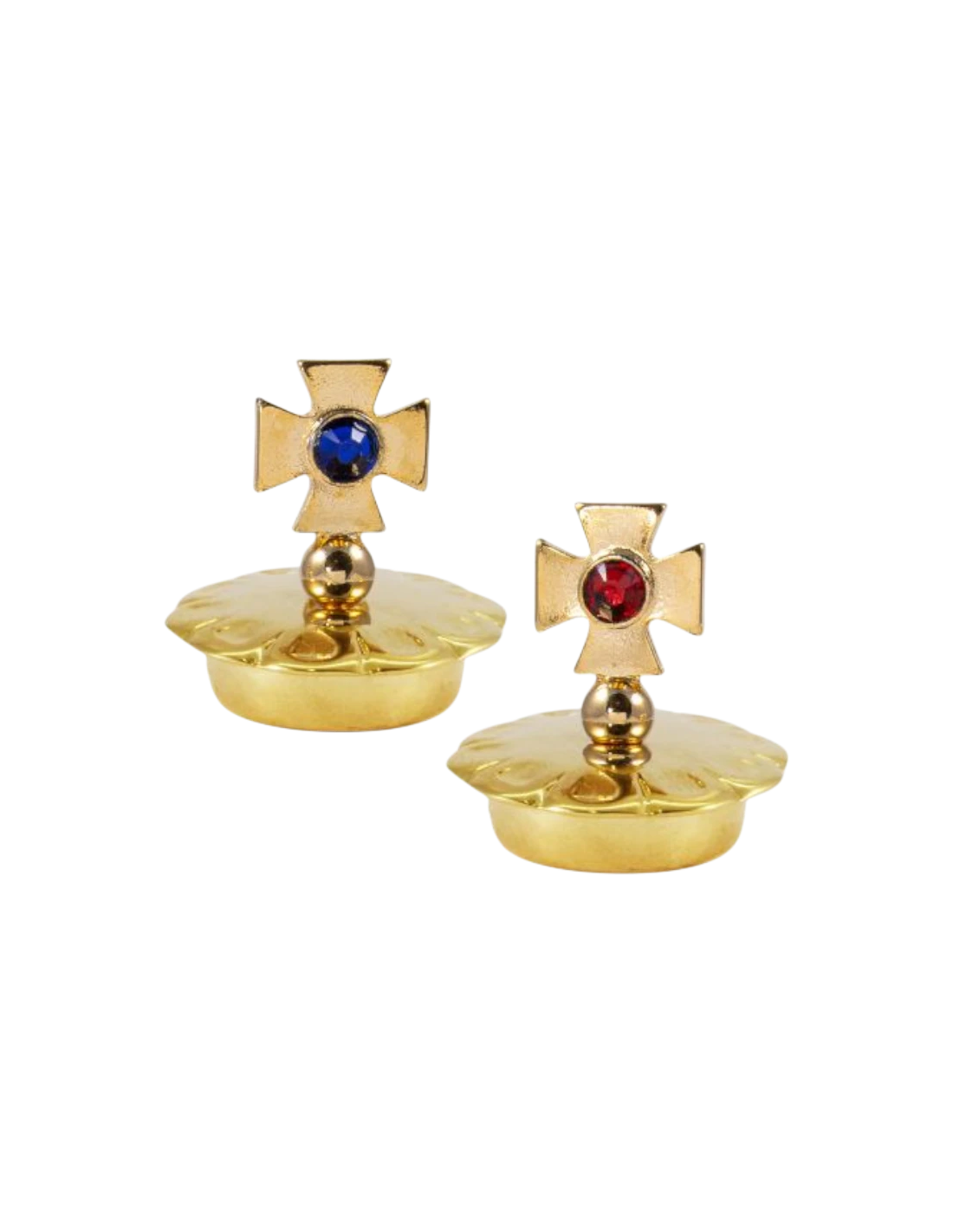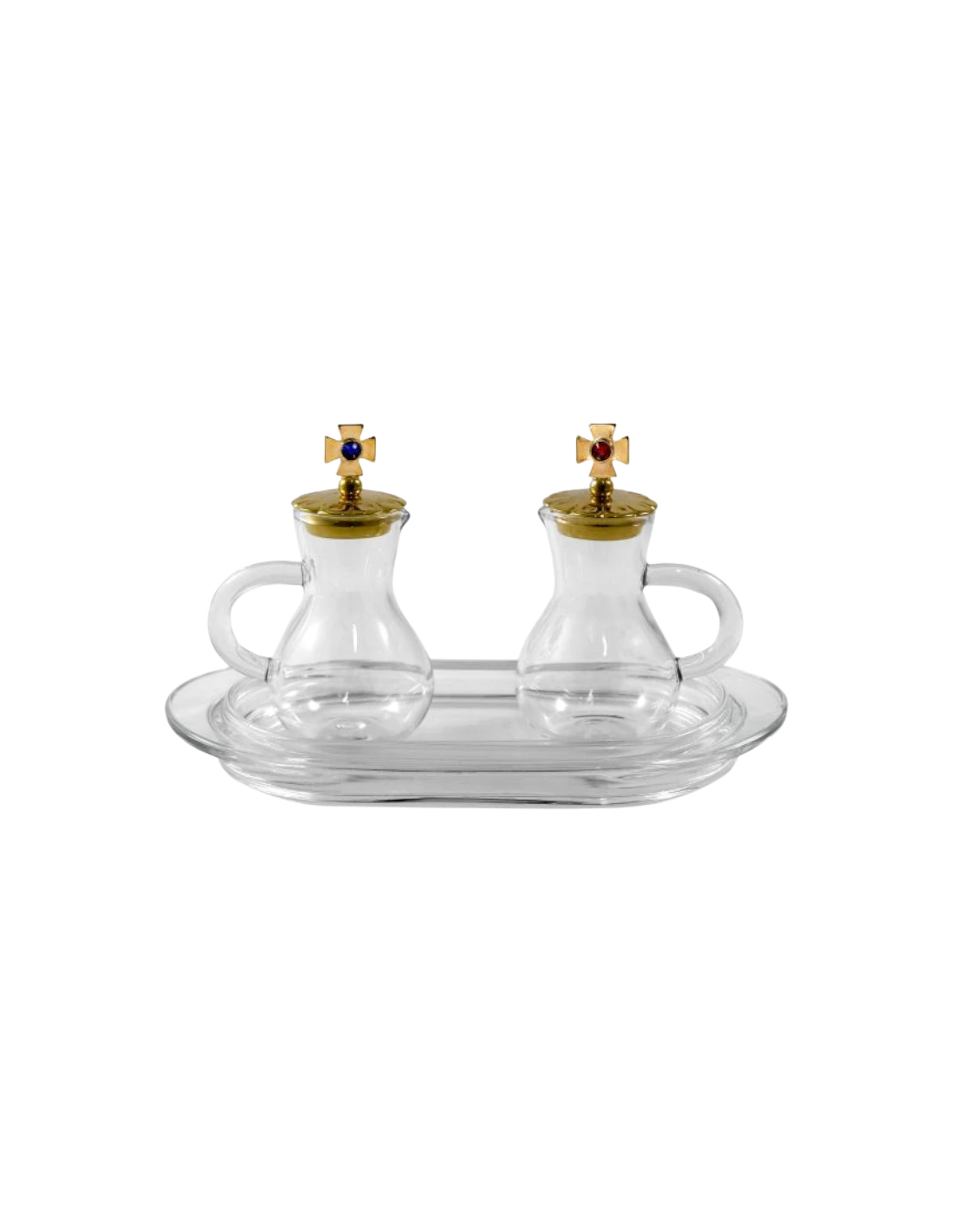 El Juego de Vinajeras Santa Cruz es una opción elegante y simbólica para el altar, diseñado con una atención especial al detalle. Las botellas de vidrio modelo "Parma" incluyen tapas en fusión metálica rematadas con una cruz dorada, lo que permite diferenciar claramente el agua y el vino durante la liturgia.